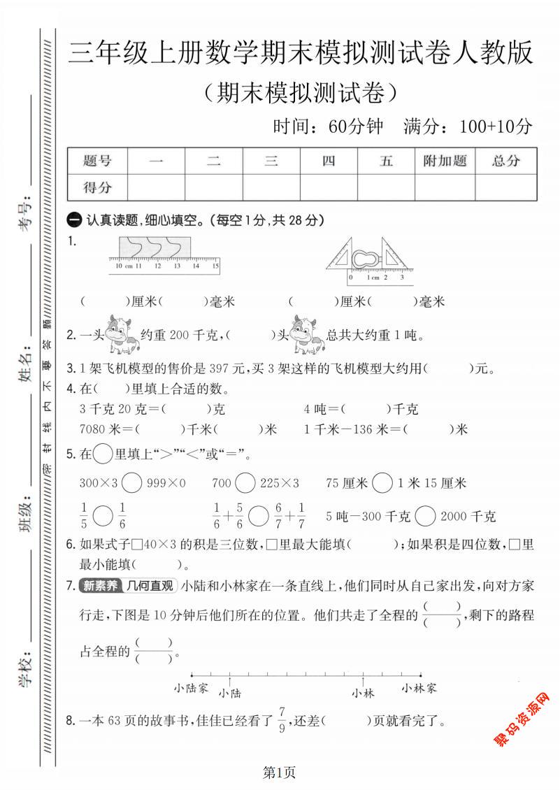 聚码网 三年级 三年级上数学期末模拟测试卷4《人教版》 http://www.appstore168.com/111615.html