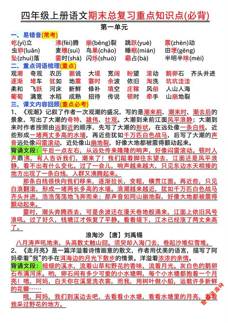 聚码网 四年级 四年级上语文期末复习重点知识点(必背) http://www.appstore168.com/111625.html