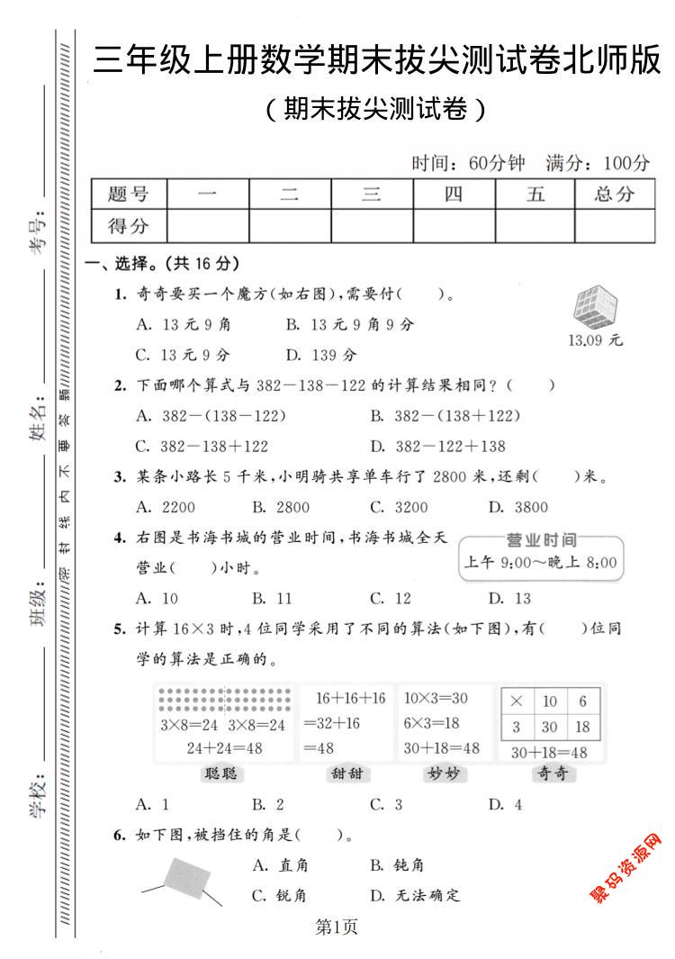 聚码网 三年级 三年级上数学期末拔尖测试卷4《北师版》 http://www.appstore168.com/111660.html