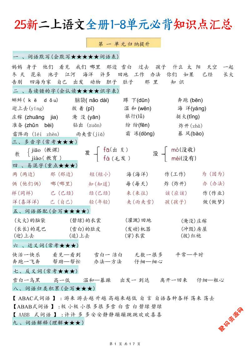 聚码网 二年级 25新二年级上语文1-8单元必背知识点汇总 http://www.appstore168.com/112116.html