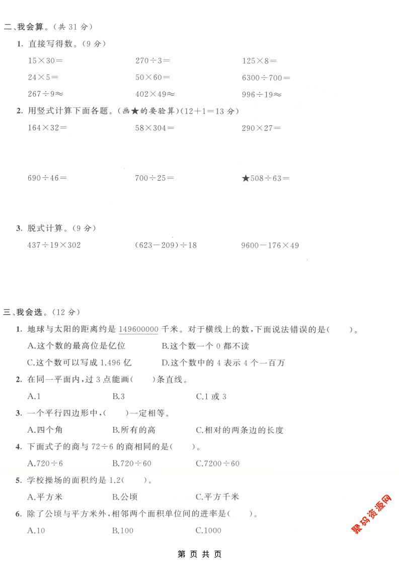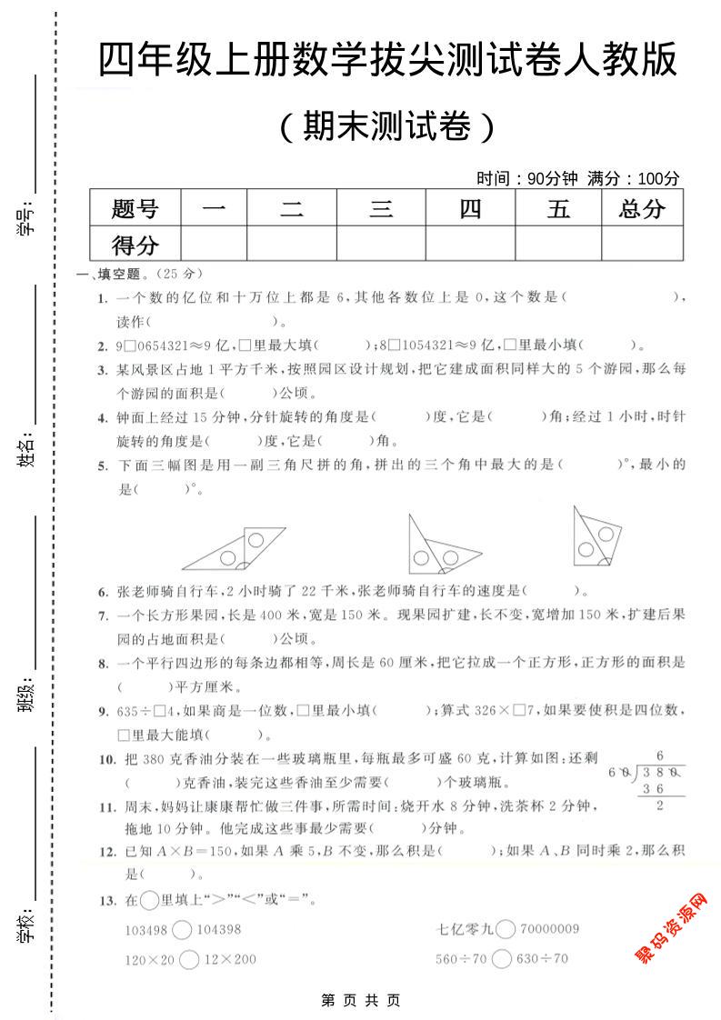 聚码网 四年级 四年级上数学期末测试卷7《人教版》 http://www.appstore168.com/112140.html