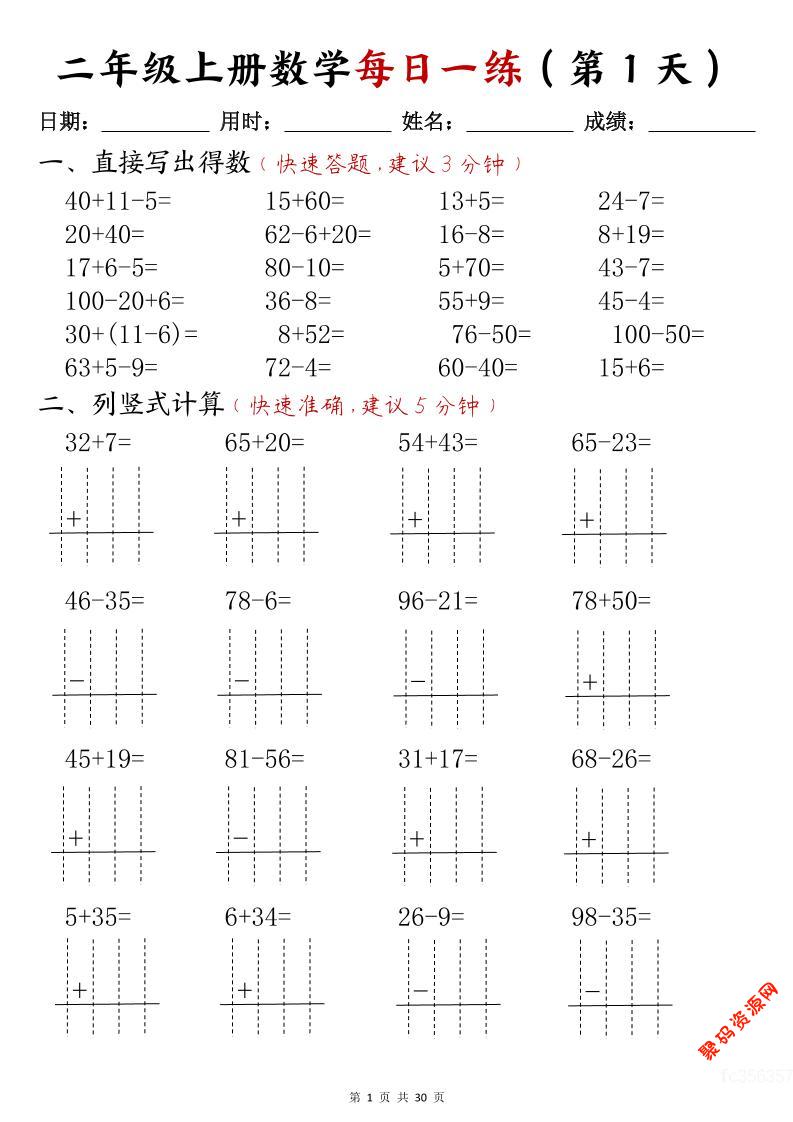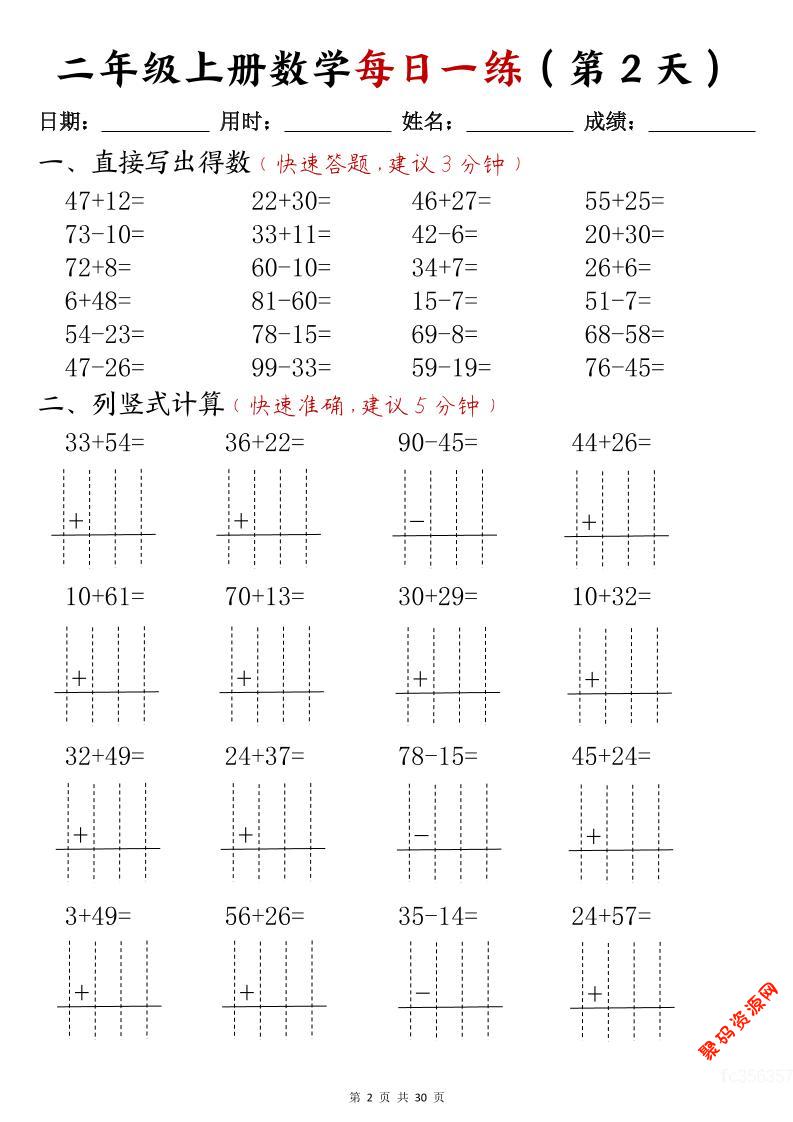 - 二年级数学下寒假作业每日一练30天(口算竖式应用题)(30页) 2026-02-16