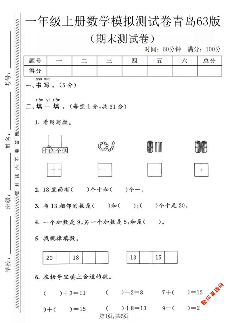 聚码网 一年级 一年级上数学期末模拟测试卷《青岛63版》 http://www.appstore168.com/113152.html