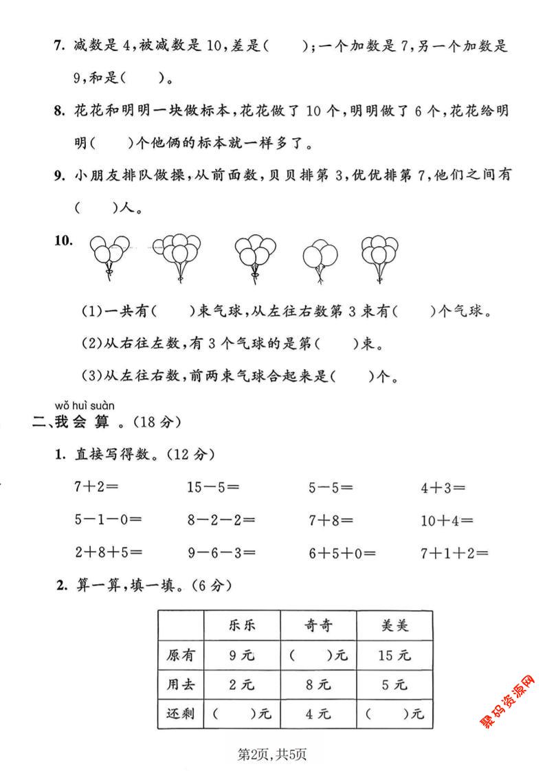 - 一年级下数学20以内加减法综合卷 2026-02-24