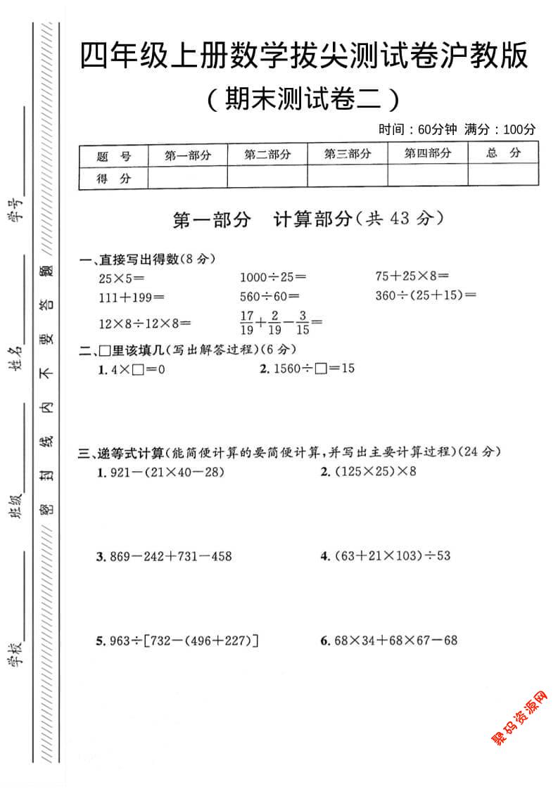 聚码网 四年级 四年级上数学期末测试卷2《沪教版》 http://www.appstore168.com/113526.html
