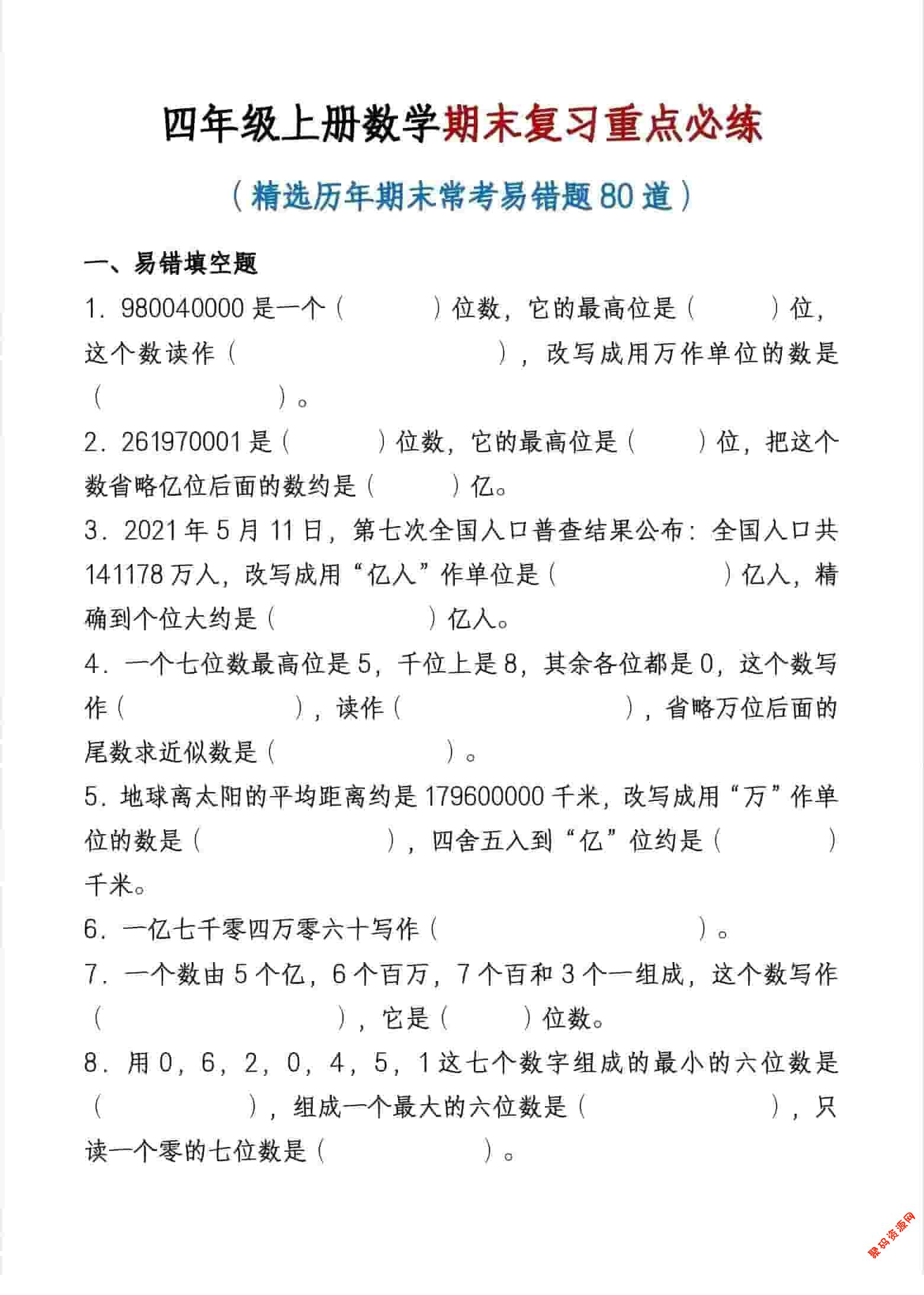 聚码网 四年级 四年级上数学期末复习重点必练 http://www.appstore168.com/113544.html