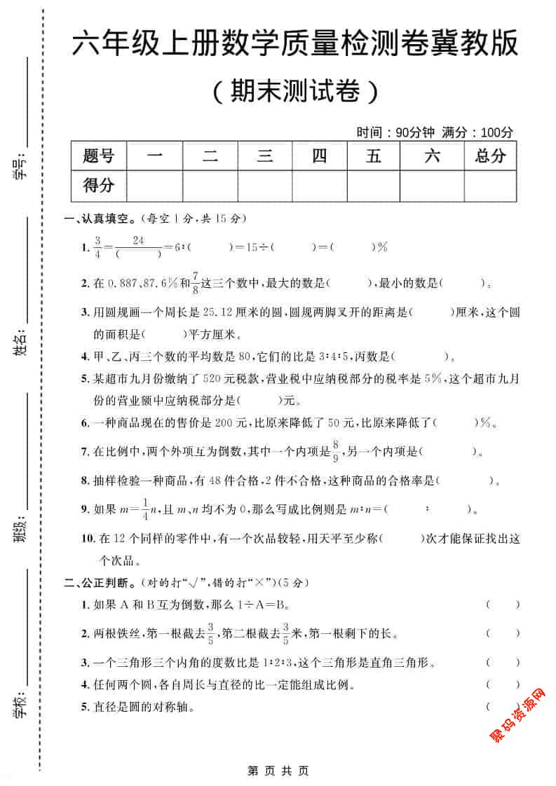 聚码网 六年级 六年级上数学期末质量检测卷4《冀教版》 http://www.appstore168.com/113561.html