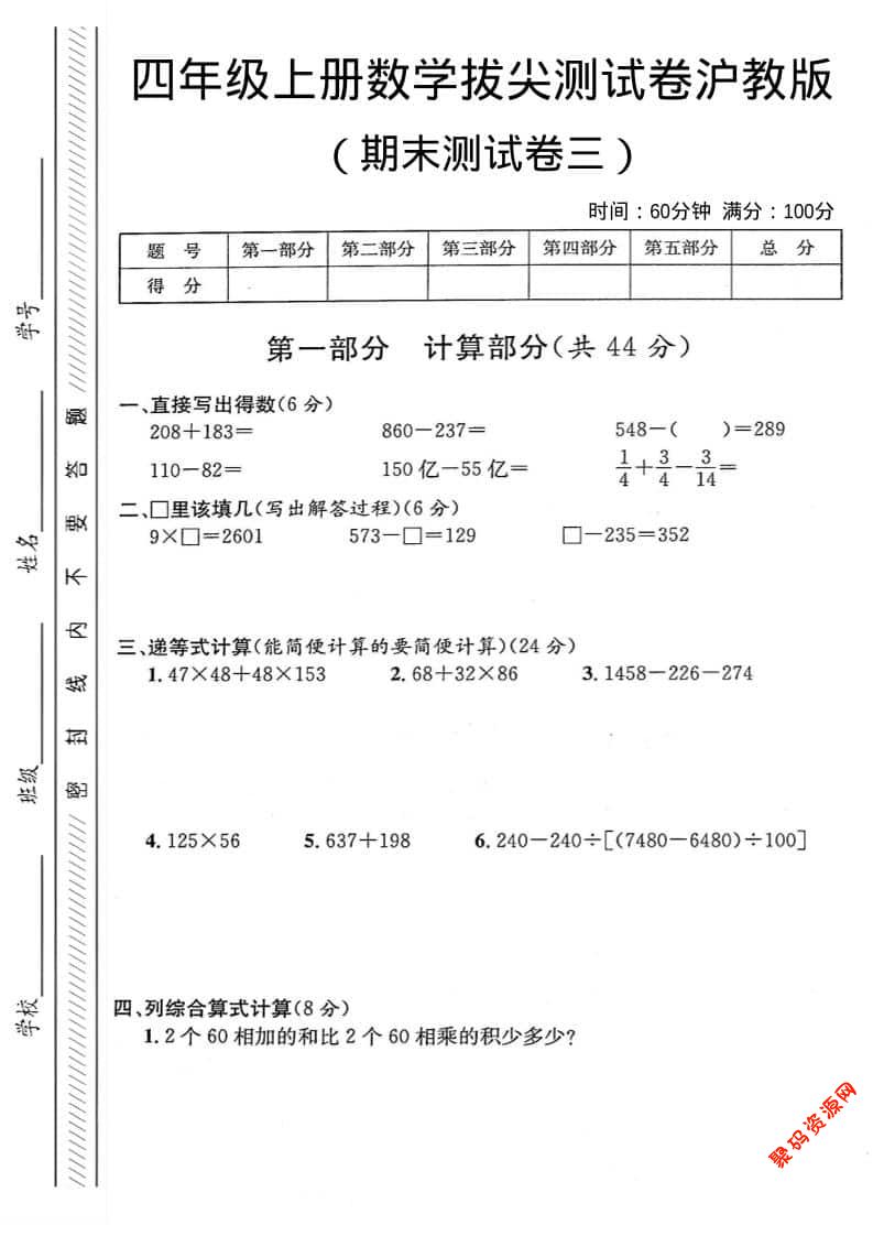 聚码网 四年级 四年级上数学期末测试卷3《沪教版》 http://www.appstore168.com/113839.html