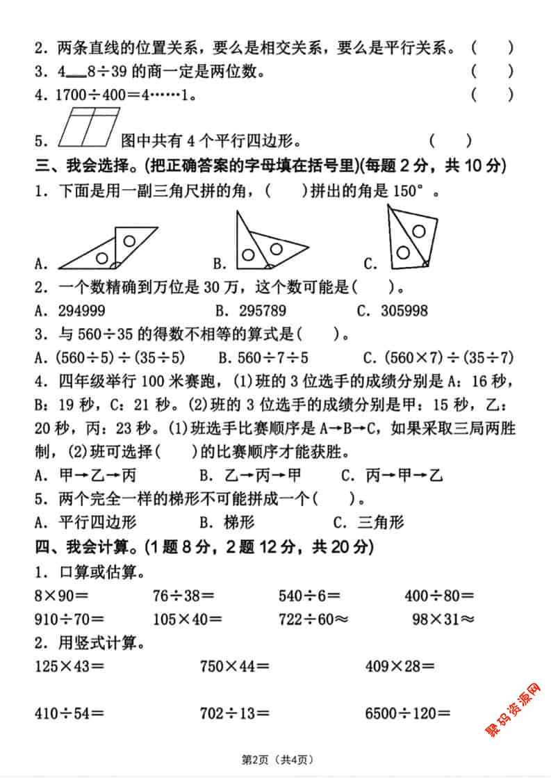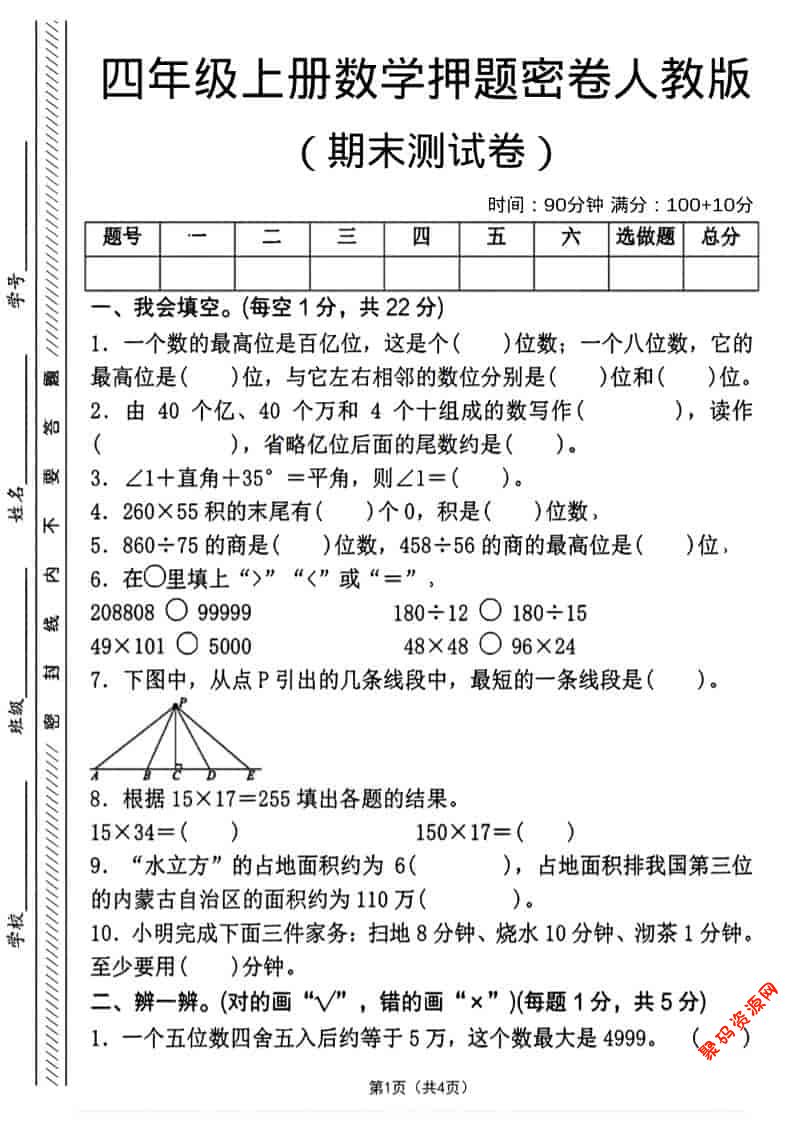 聚码网 四年级 四年级上数学期末押题测试卷4《人教版》 http://www.appstore168.com/113848.html
