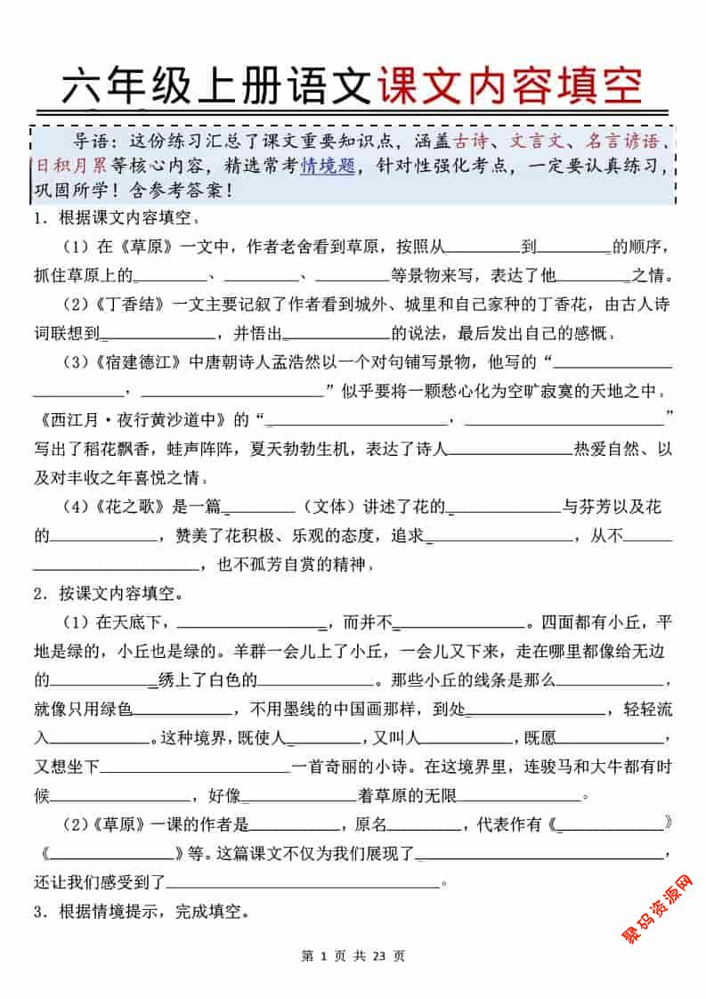 - 六下语文寒假预习知识晨读单-23页 2026-02-17