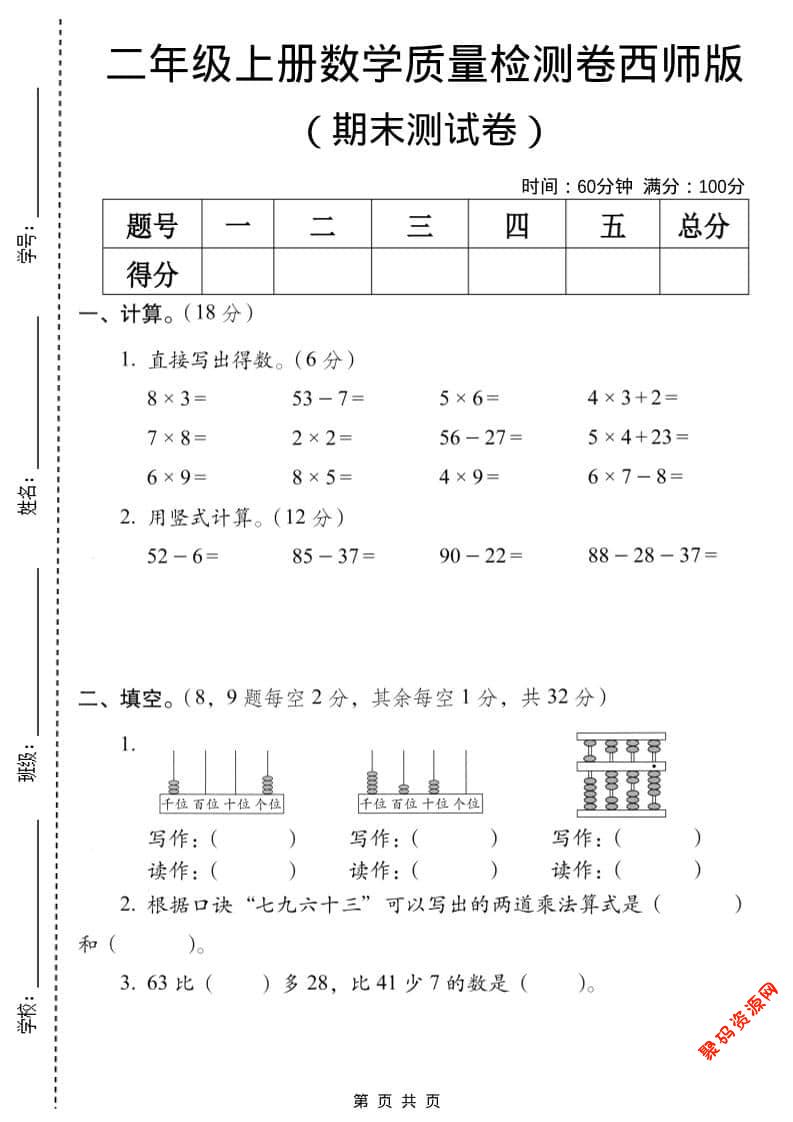 聚码网 二年级 二年级上数学期末质量检测卷7《西师版》 http://www.appstore168.com/113921.html