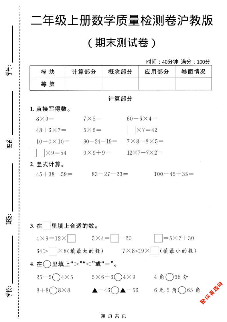 聚码网 二年级 二年级上数学期末质量检测卷2《沪教版》 http://www.appstore168.com/114114.html