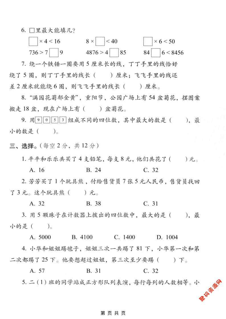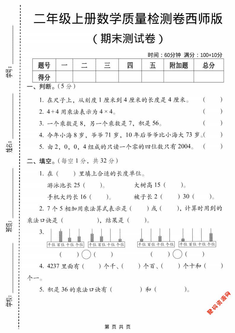 聚码网 二年级 二年级上数学期末质量检测卷5《西师版》 http://www.appstore168.com/114538.html