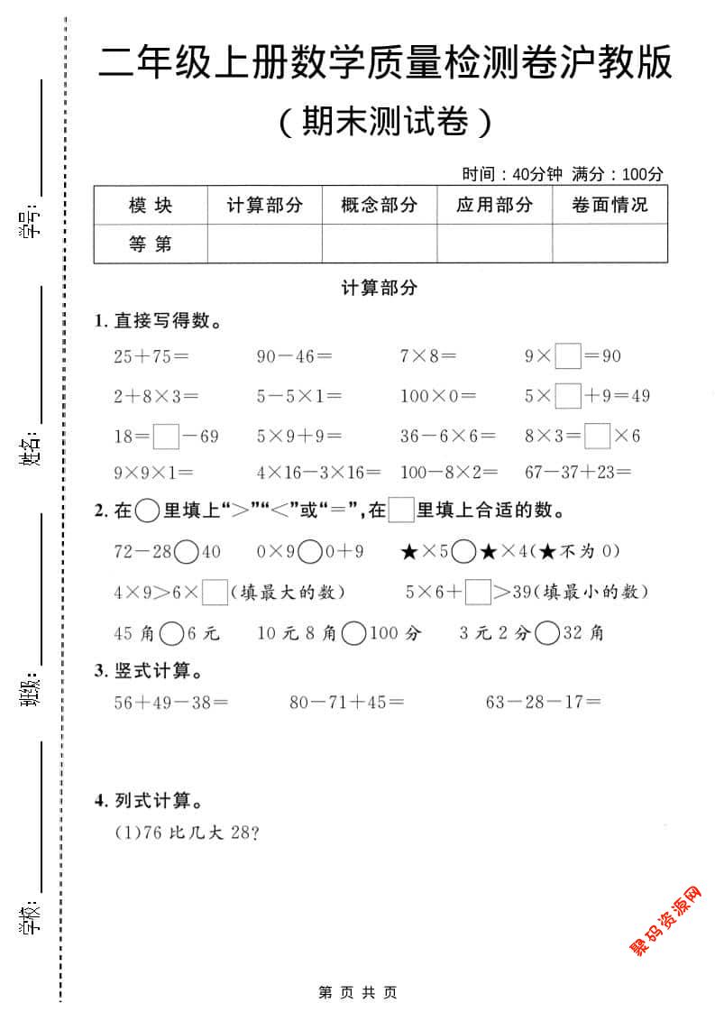 聚码网 二年级 二年级上数学期末质量检测卷3《沪教版》 http://www.appstore168.com/114542.html