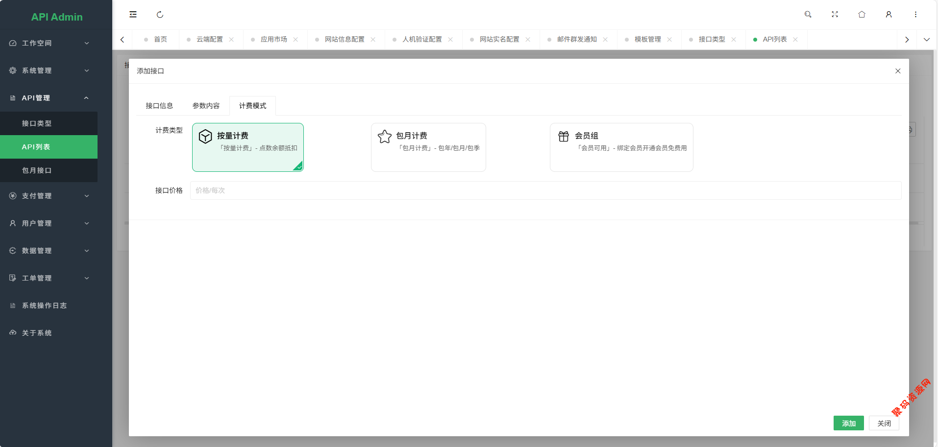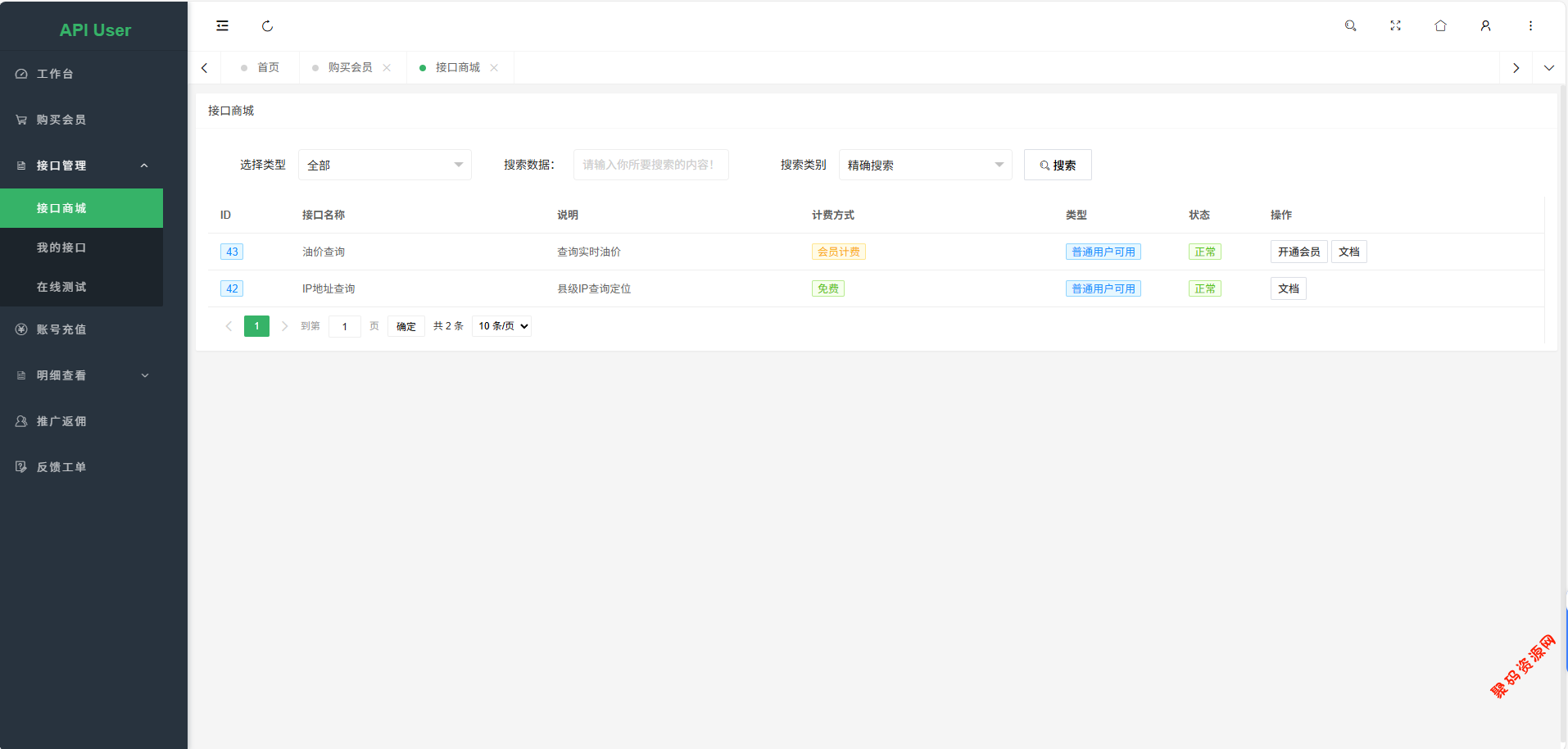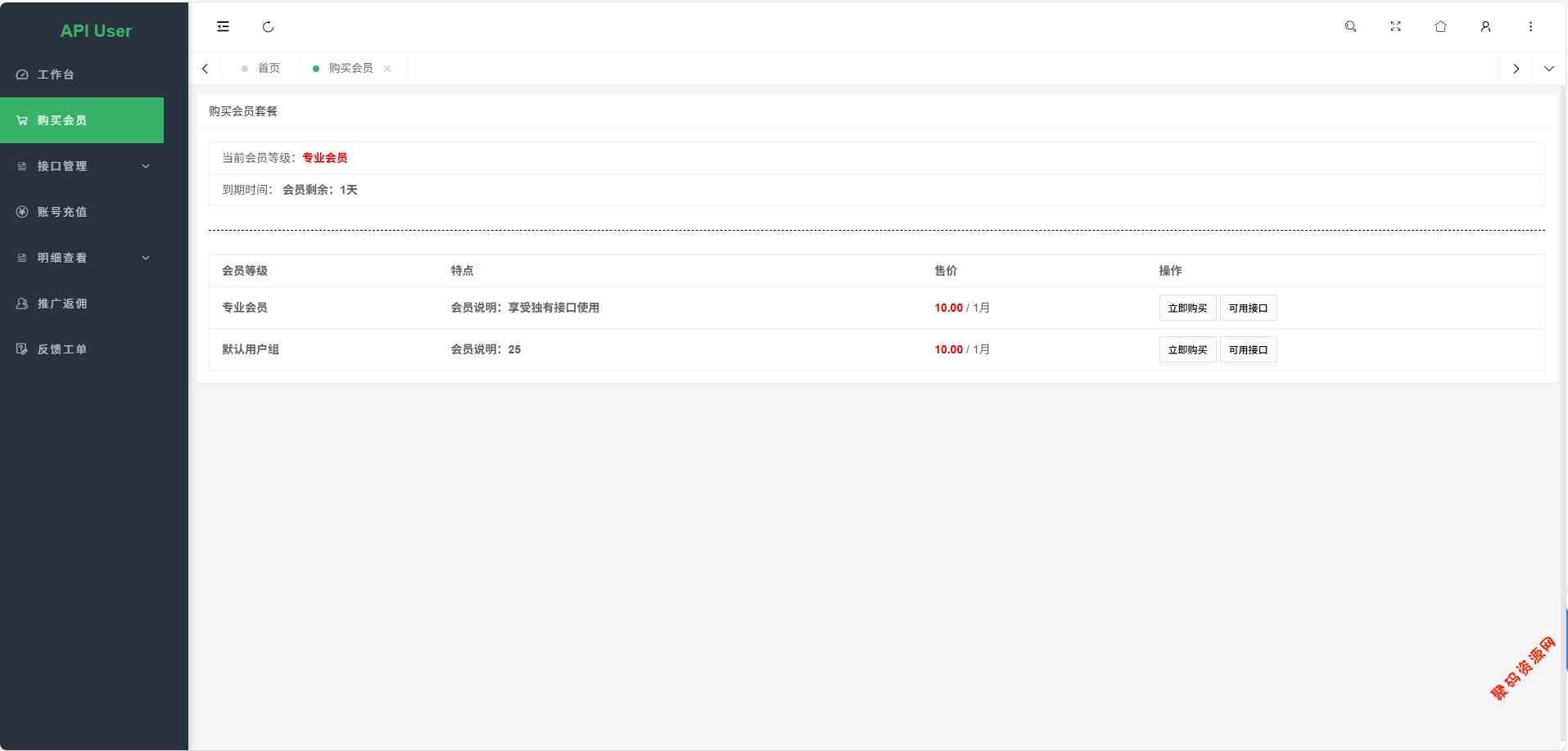 基于 PHP+Mysql 进行开发的,拥有多接口管理功能,支持不同的计费方式包括包月、按次、会员专享。用户可以全自动注册使用,系统支持在线调试和日志记录。现有API接口只需要几行代码就可以接入本系统,实现不同的计费方式。