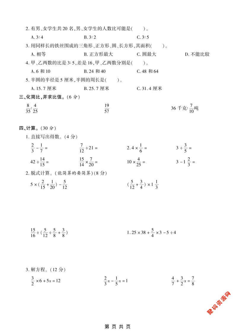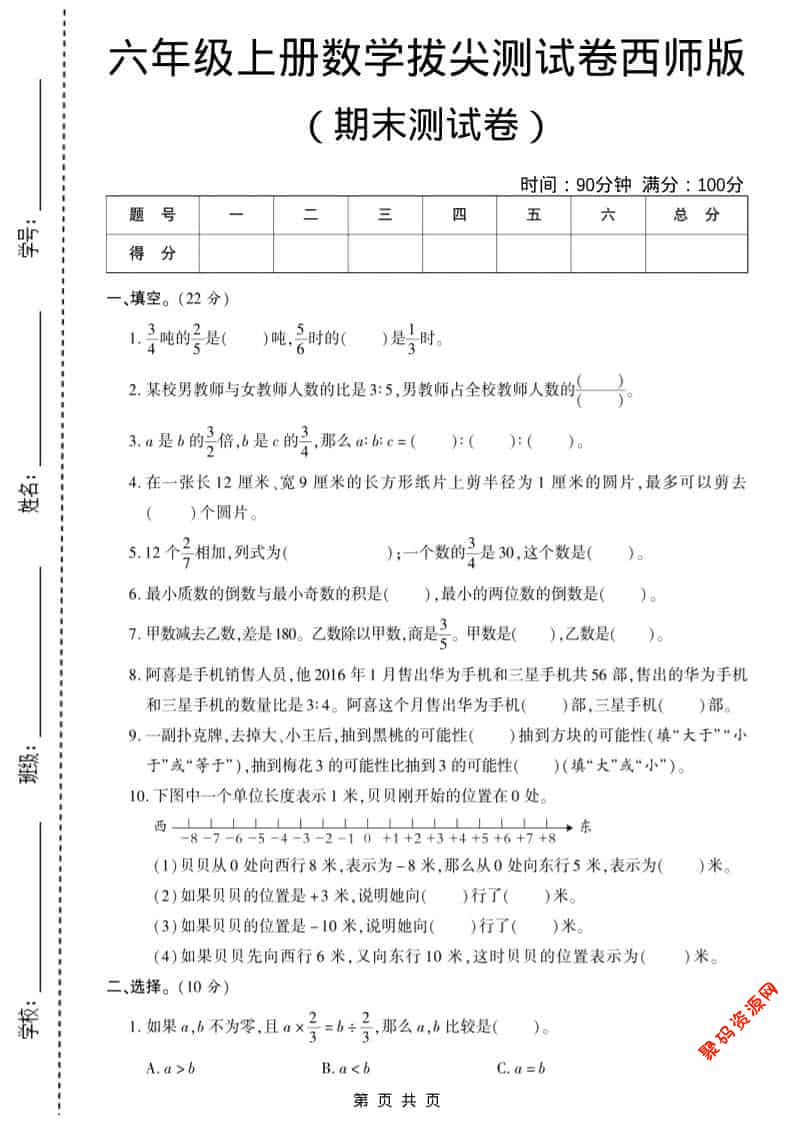 聚码网 六年级 六年级上数学期末测试卷10《西师版》 http://www.appstore168.com/114883.html