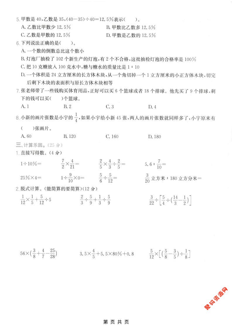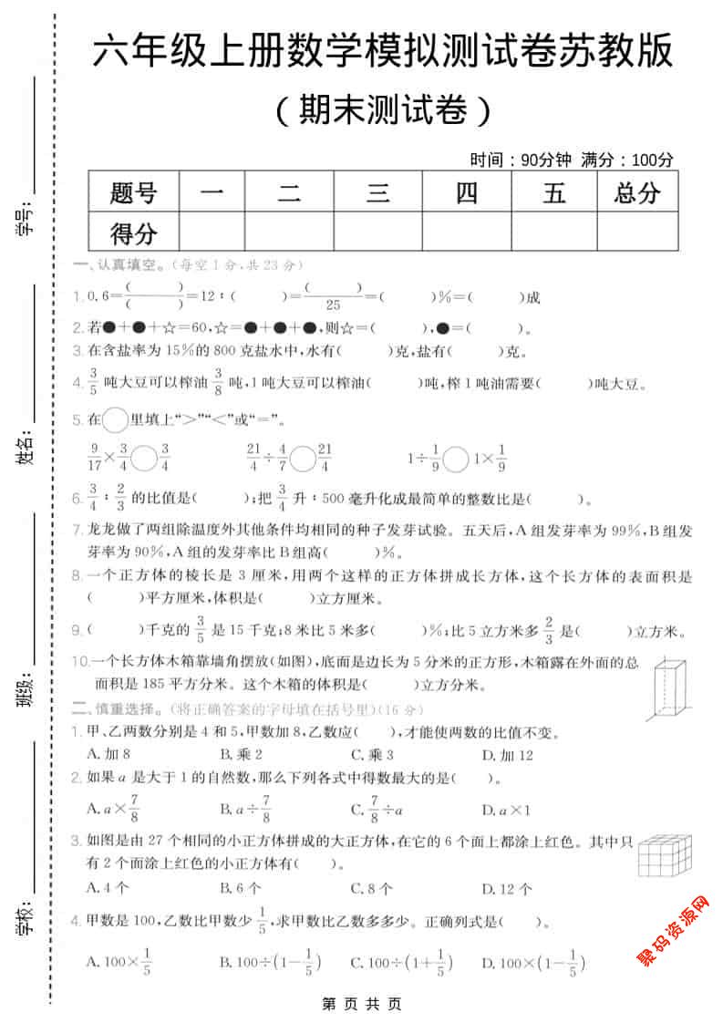 聚码网 六年级 六年级上数学期末模拟测试卷5《苏教版》 http://www.appstore168.com/114889.html