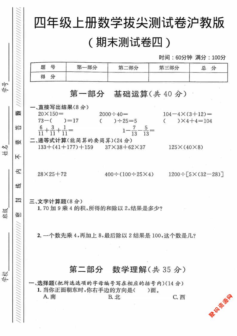聚码网 四年级 四年级上数学期末测试卷4《沪教版》 http://www.appstore168.com/115053.html