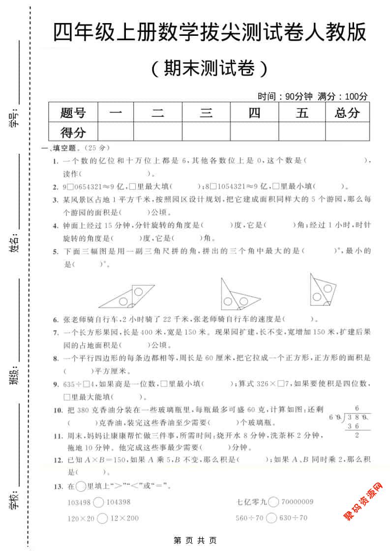 聚码网 四年级 四年级上数学期末拔尖测试卷7《人教版》 http://www.appstore168.com/115080.html