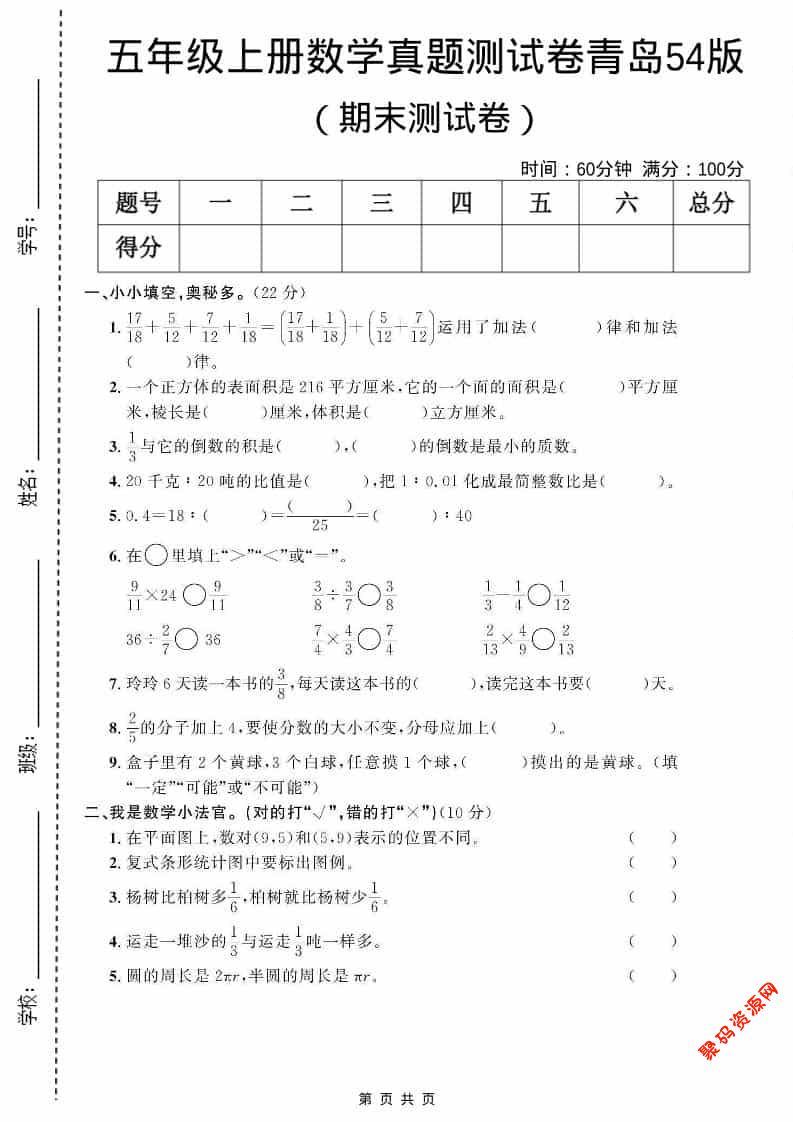 聚码网 五年级 五年级上数学期末测试卷3《青岛54版》 http://www.appstore168.com/115345.html