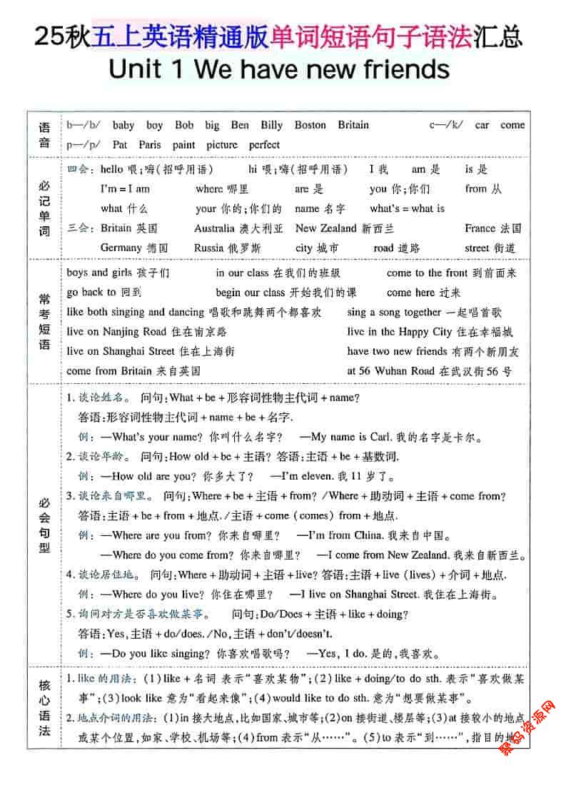 聚码网 五年级 五年级上上英语单词短语句子语法汇总人教精通版 http://www.appstore168.com/115382.html