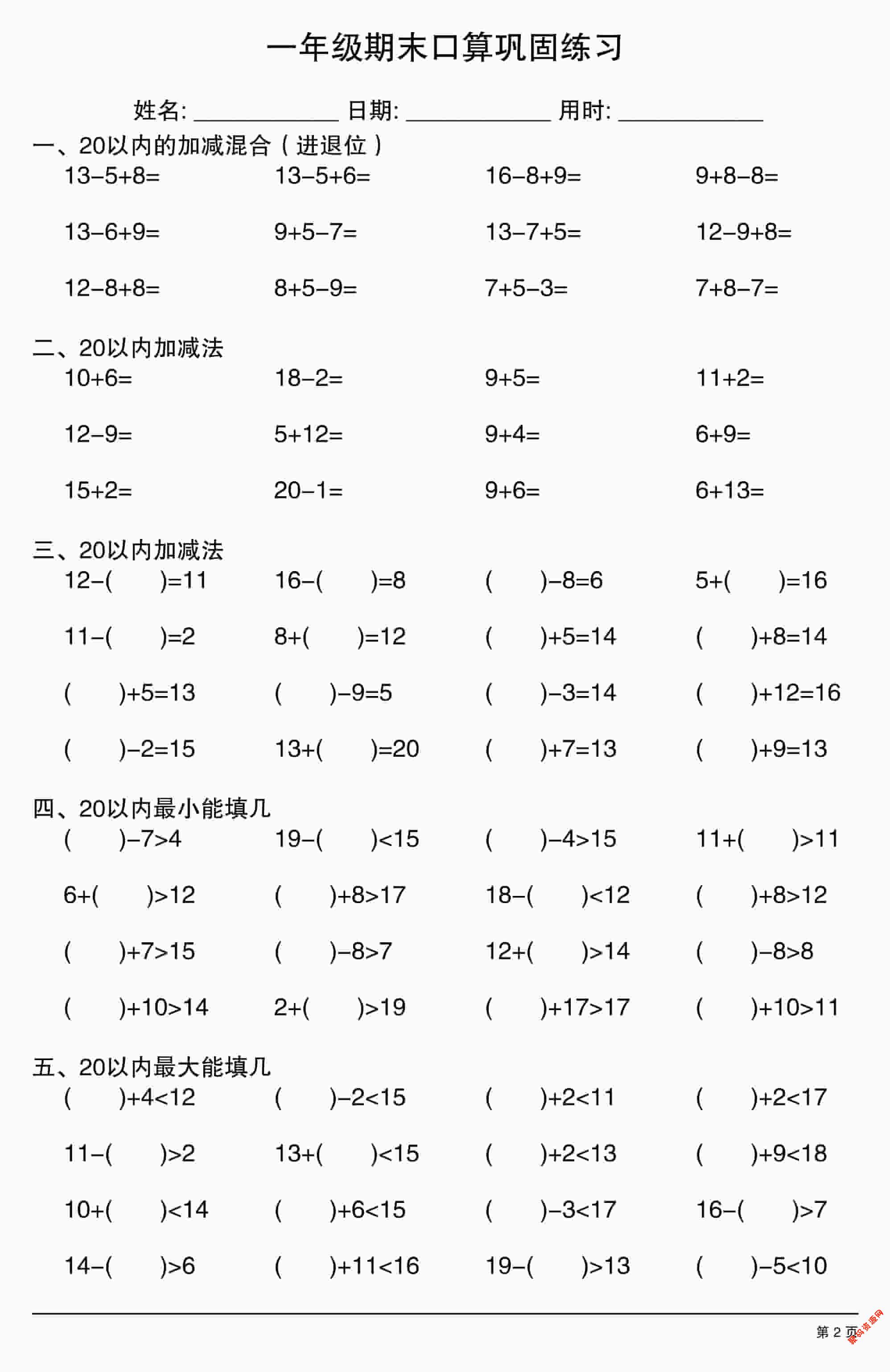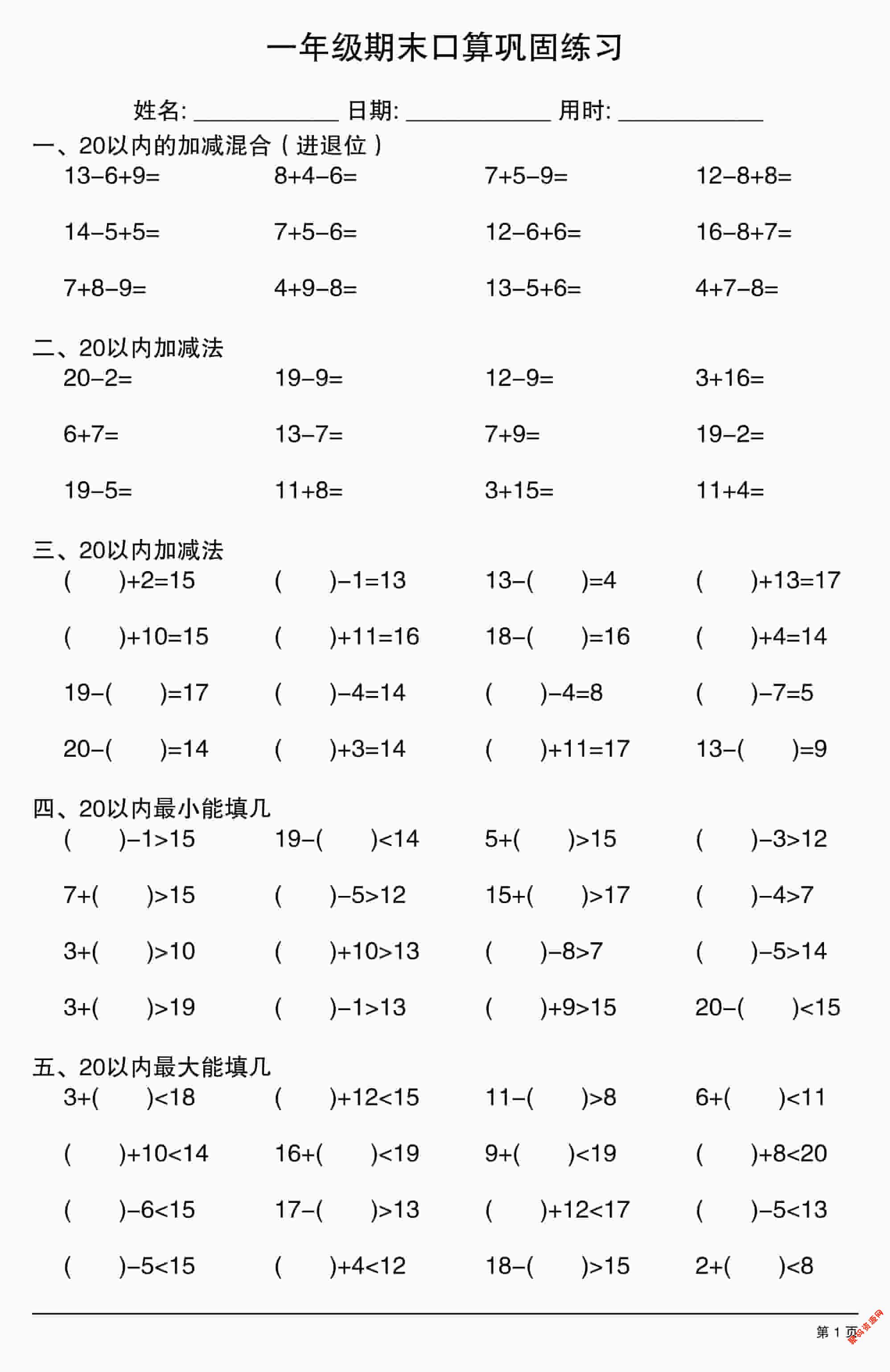 - 一年级下数学20以内加减法综合卷 2026-02-24