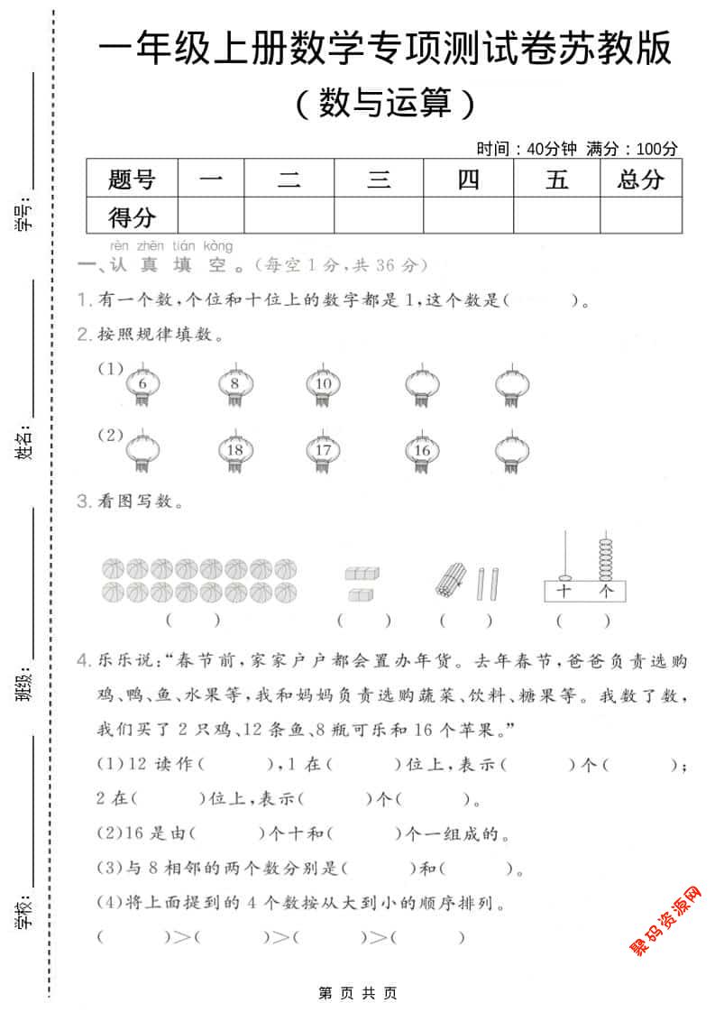 聚码网 一年级 一年级上数学数与运算专项测试卷《苏教版》 http://www.appstore168.com/115410.html