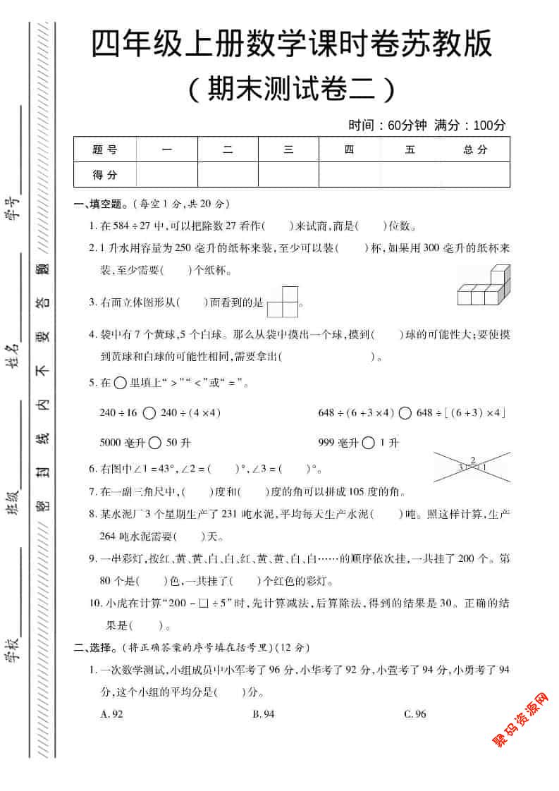 聚码网 四年级 四年级上数学期末课时卷2《苏教版》 http://www.appstore168.com/115599.html