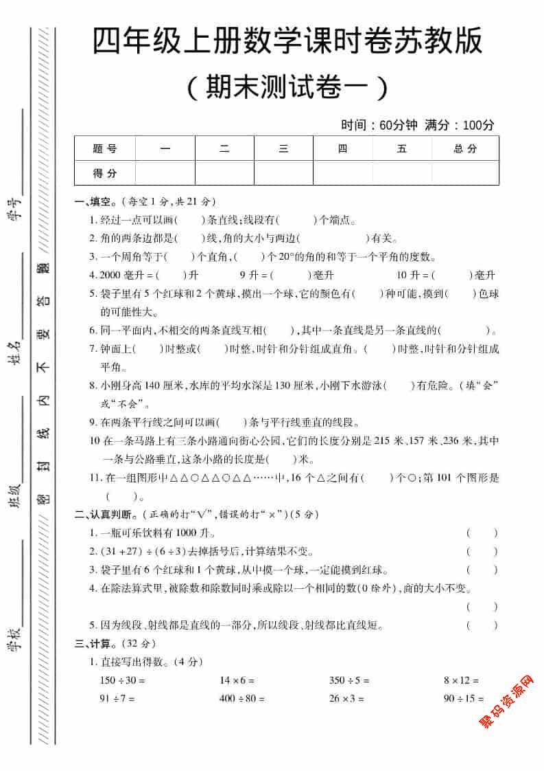聚码网 四年级 四年级上数学期末课时卷1《苏教版》 http://www.appstore168.com/115604.html