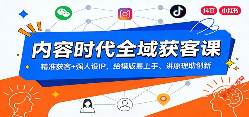 本套内容时代全域获客课,聚焦内容红利下的获客与品牌升级,专为创业者、运营者及个体创业者打造。课程打通 “高效精准获客” 到 “强人设 IP 品牌” 全链路,既提供可直接复用的实操模版,助力学员快速上手落地,解决从 0 到 1 的获客难题;又深度拆解底层逻辑与原理,支撑学员结合自身业务自由创新,形成差异化竞争力。拒绝空洞理论,兼顾实操性与创新性,帮助学员精准捕捉内容流量,搭建专属人设 IP,实现从流量获取到品牌沉淀的闭环,突破获客瓶颈,构建可持续增长的业务体系。