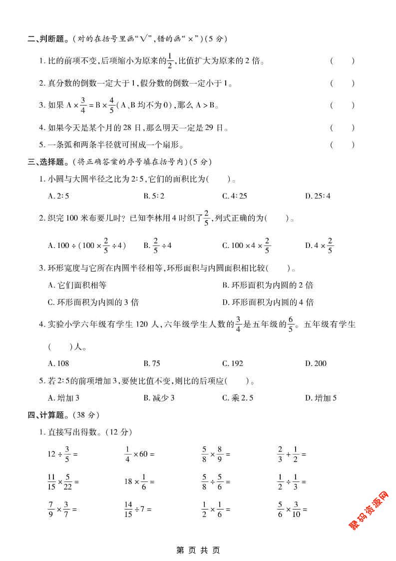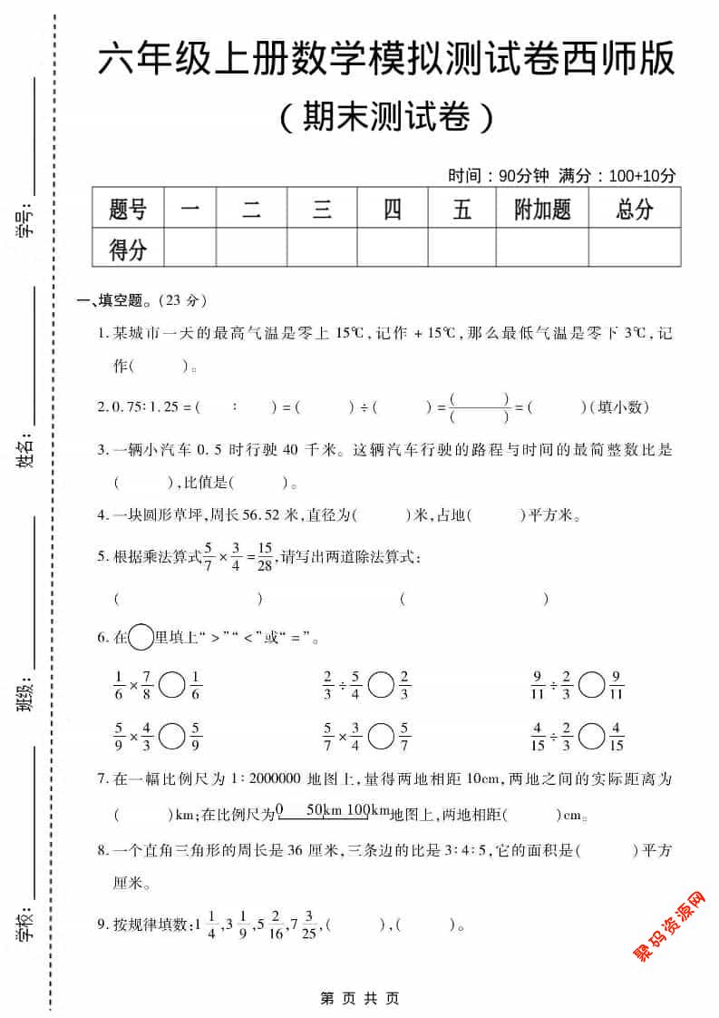 聚码网 六年级 六上西师版数学【期末测试卷6】 http://www.appstore168.com/115888.html