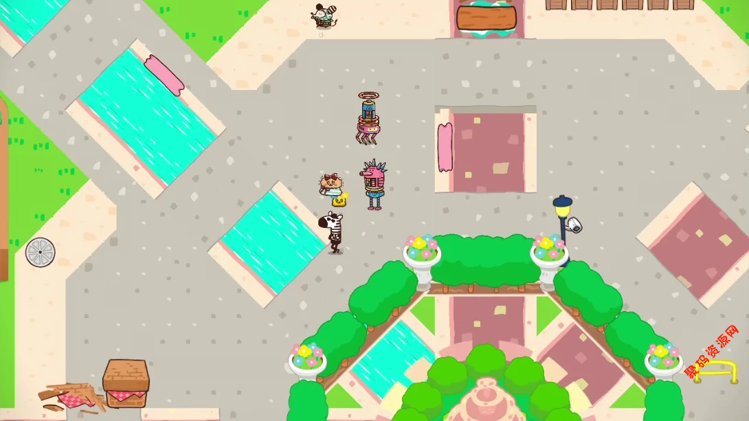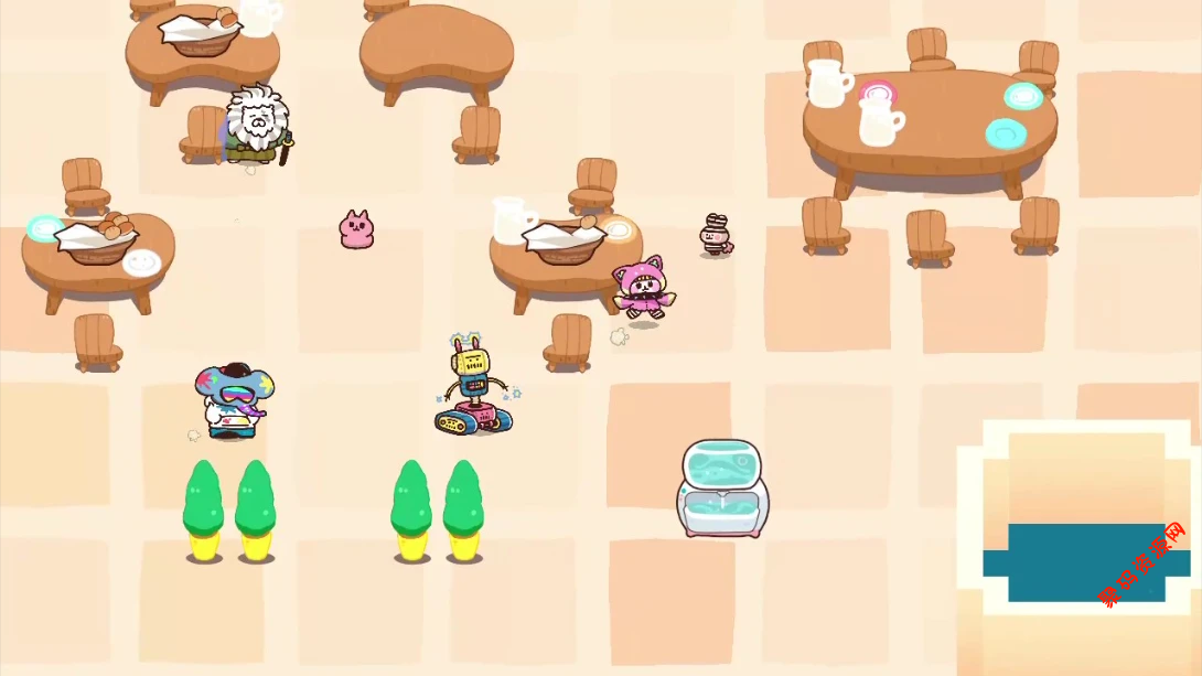 阵营对抗:4只动物(比如黑帮兔、网红猫)vs 2个机器人,动物靠噗噗蛋(加速、补给)和嘘嘘炮(干扰)逃脱,机器人用各种工具抓人。