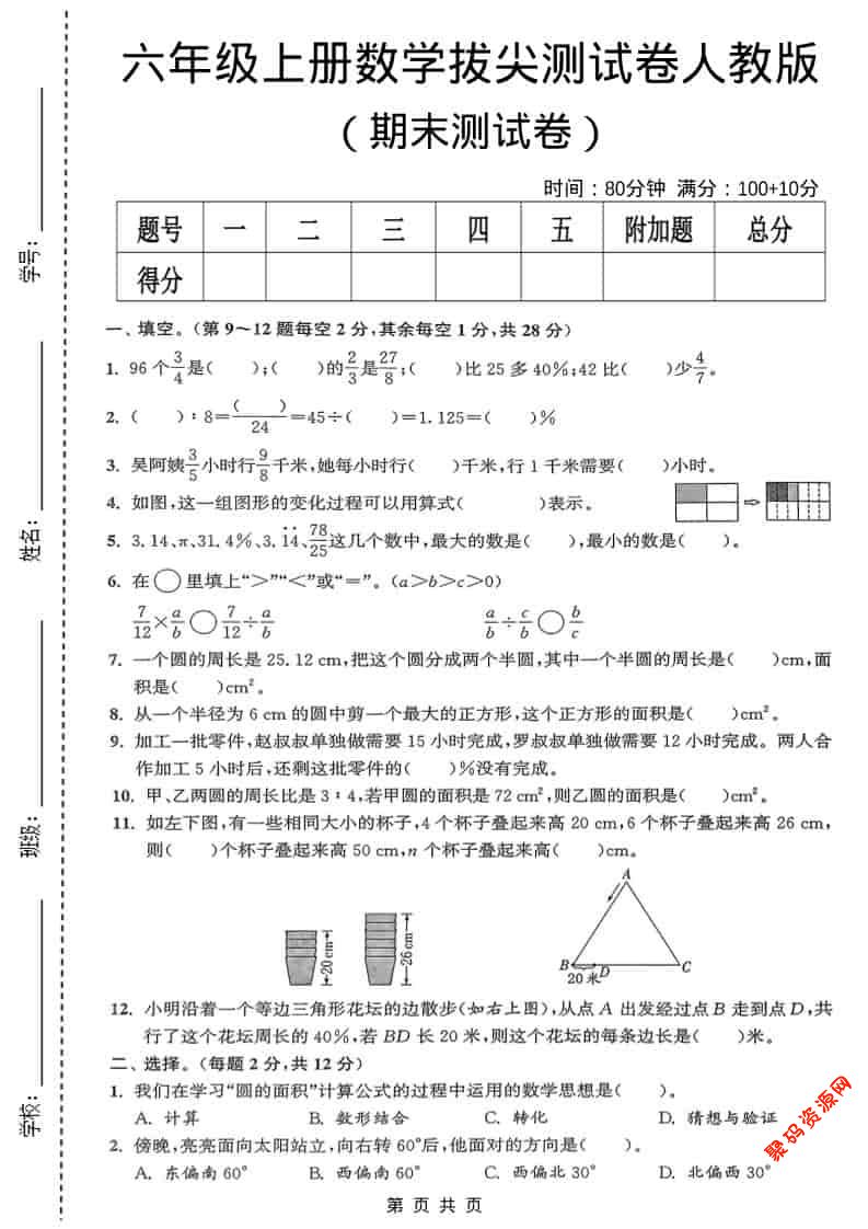 聚码网 六年级 六年级上数学期末测试卷《人教版》 http://www.appstore168.com/116637.html