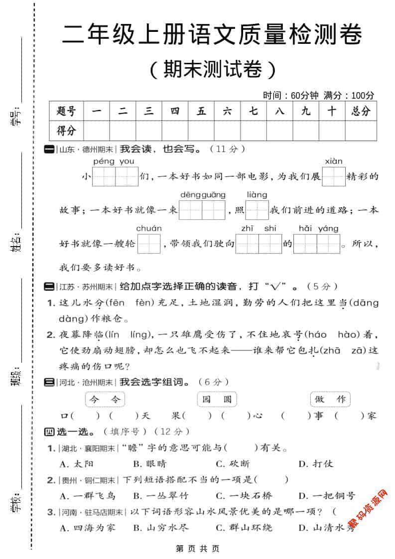 聚码网 二年级 二年级上语文期末质量检测卷2 http://www.appstore168.com/116658.html