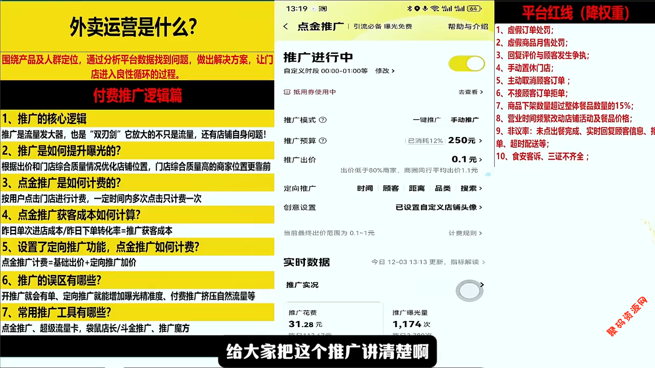 课程来自老黄的2026餐饮店铺外卖商家必修课。帮你彻底搞懂线上运营的门道。课程从认知入手,拆解外卖核心逻辑、前台搭建、活动配置,再到推广与店铺权重提升,不讲虚的,只教实用、能落地的经验。适合想做好外卖的餐饮老板和运营者,帮你改变思维、提升能力,实实在在把单量做起来。