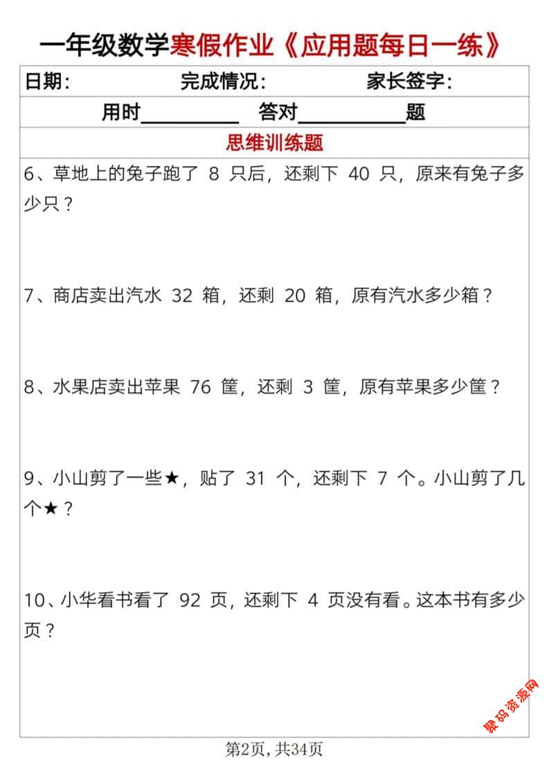 聚码网 一年级 一年级上数学寒假作业《应用题每日一练》34页 http://www.appstore168.com/116890.html