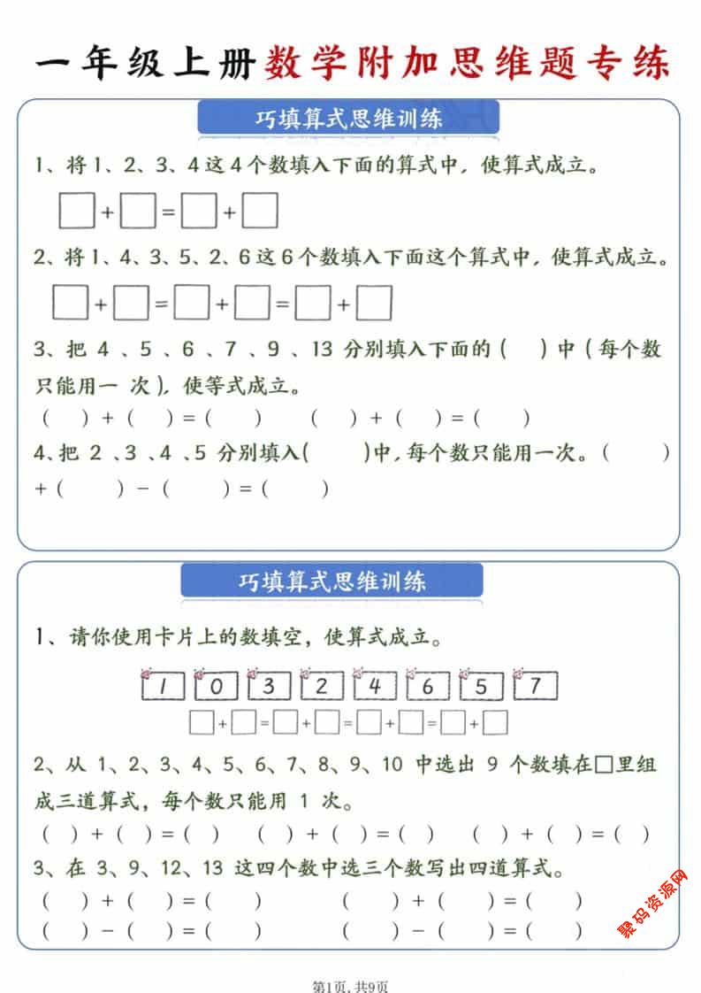 聚码网 一年级 新一年级上册数学附加思维题专练9页 http://www.appstore168.com/117059.html