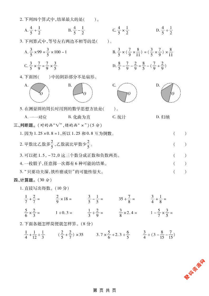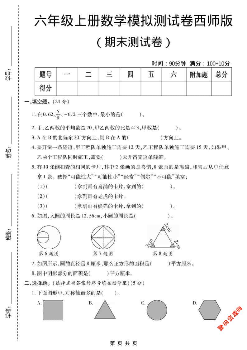 聚码网 六年级 六年级上数学期末测试卷2《西师版》 http://www.appstore168.com/117070.html