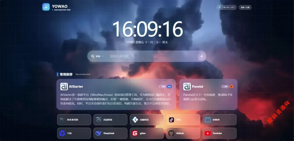 Yowao Navigation Pro 是一款基于 WordPress 开发的高性能导航主题。它采用了独特的“棱镜”视觉风格(Prism UI),集成了银行级 CSRF 安全防护,并针对国内网络环境进行了深度优化。 它不仅仅是一个导航站,更是一个属于你的个性化网络入口。支持 iOS 风格锁屏时钟、3D 玻璃拟态卡片、私有书签收藏以及极其丝滑的交互体验。 🎉 完全开源,没有任何限制!