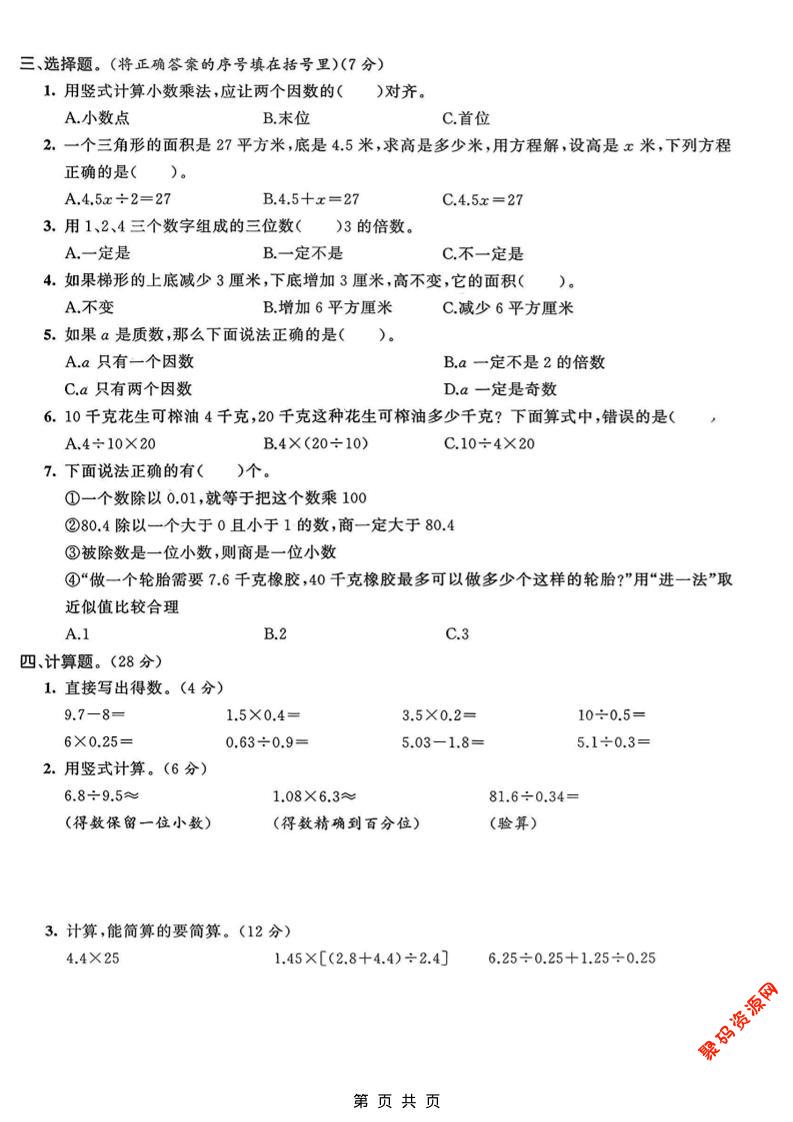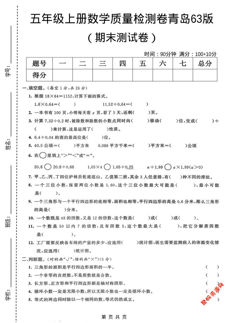 聚码网 五年级 五年级上数学期末质量检测卷4《青岛63版》 http://www.appstore168.com/117381.html