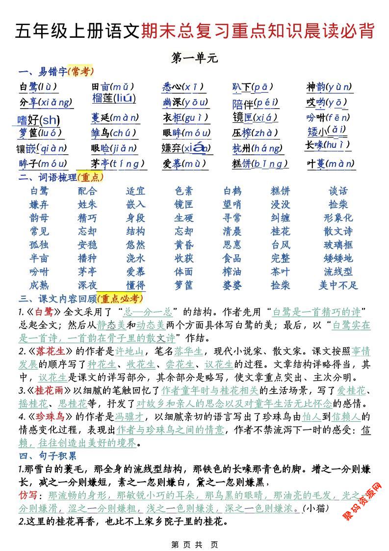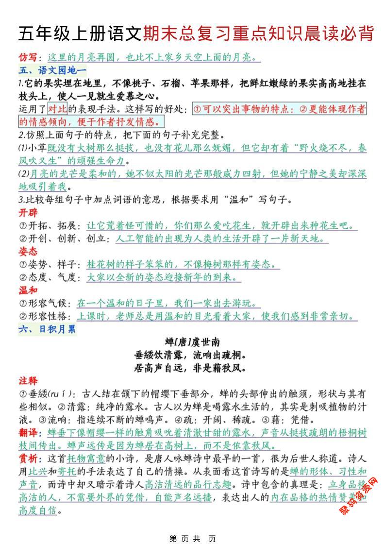 聚码网 五年级 五年级上语文期末总复习重点知识晨读必背 http://www.appstore168.com/117681.html