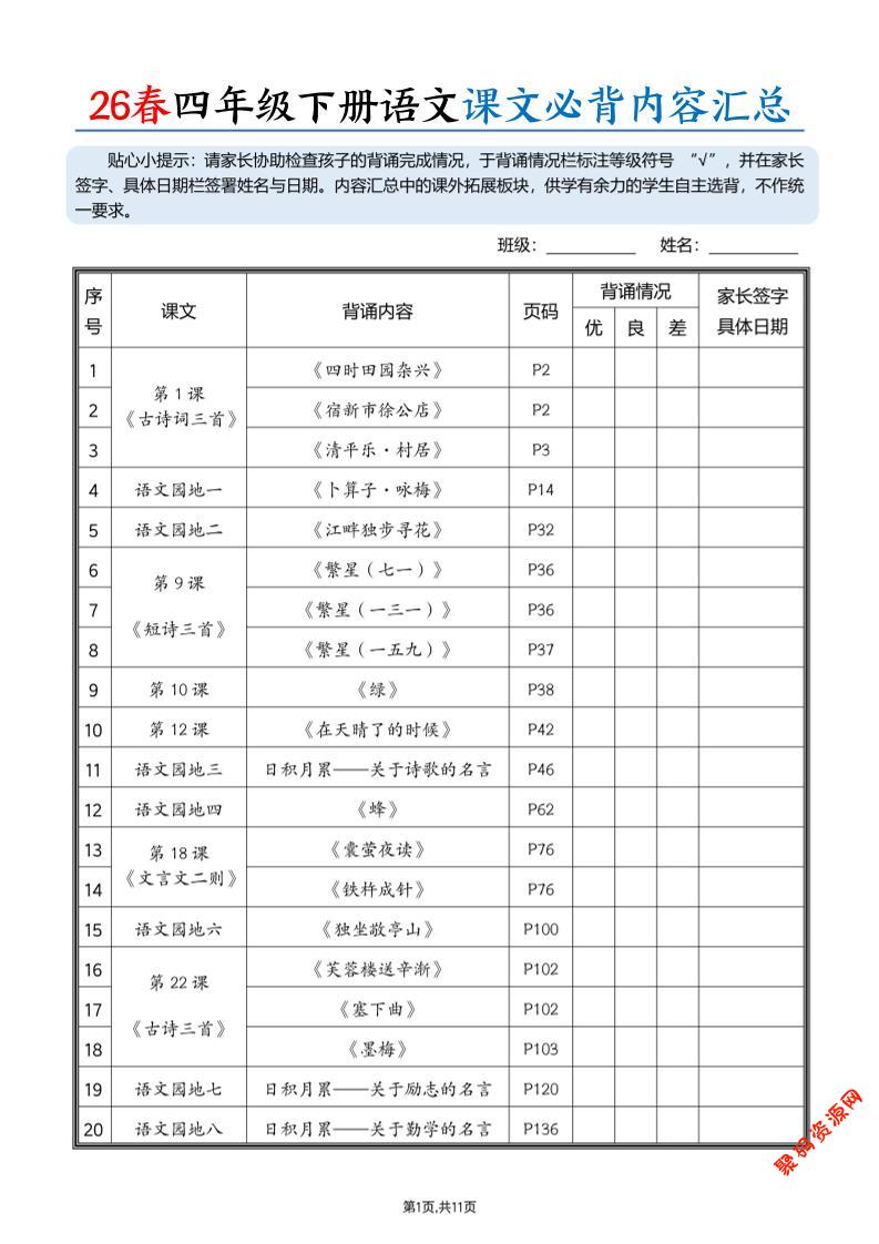 聚码网 四年级 26春四下语文课文必背内容汇总(11页) http://www.appstore168.com/117798.html