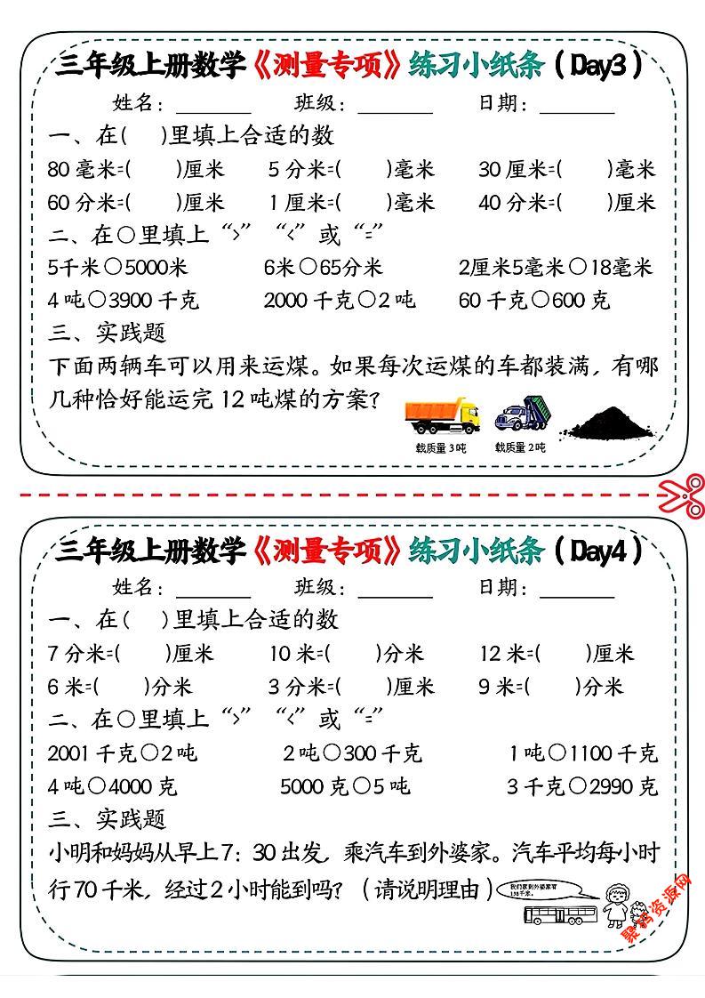 聚码网 三年级 三年级上数学《测量专项》练习小纸条 http://www.appstore168.com/118013.html