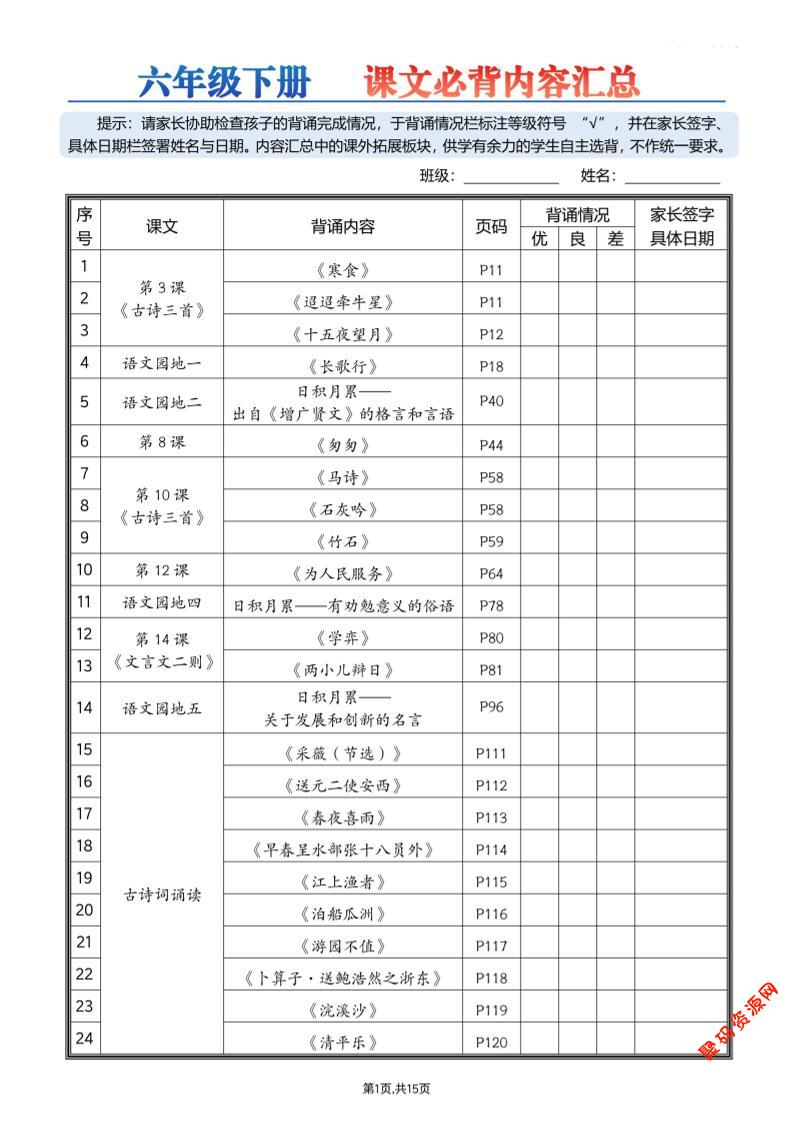聚码网 六年级 26春六下语文课文必背内容汇总15页 http://www.appstore168.com/118278.html