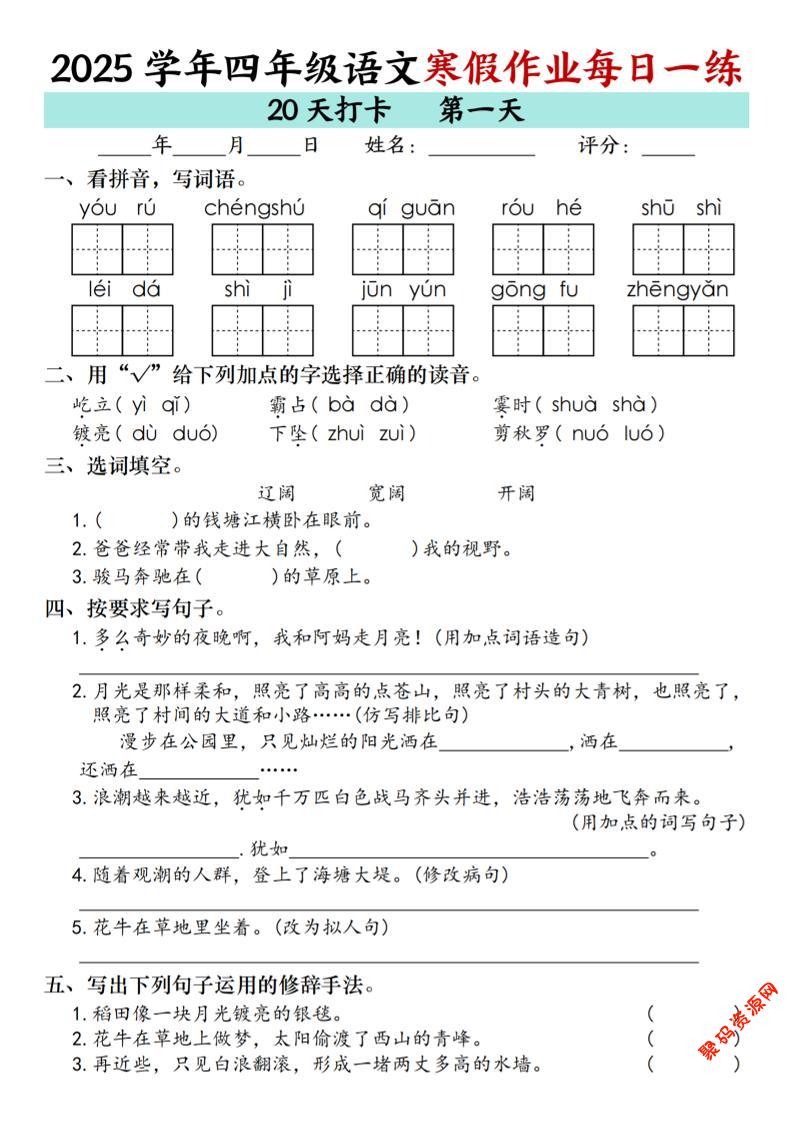 聚码网 四年级 四年级上语文寒假作业每日一练(共20天) http://www.appstore168.com/118378.html