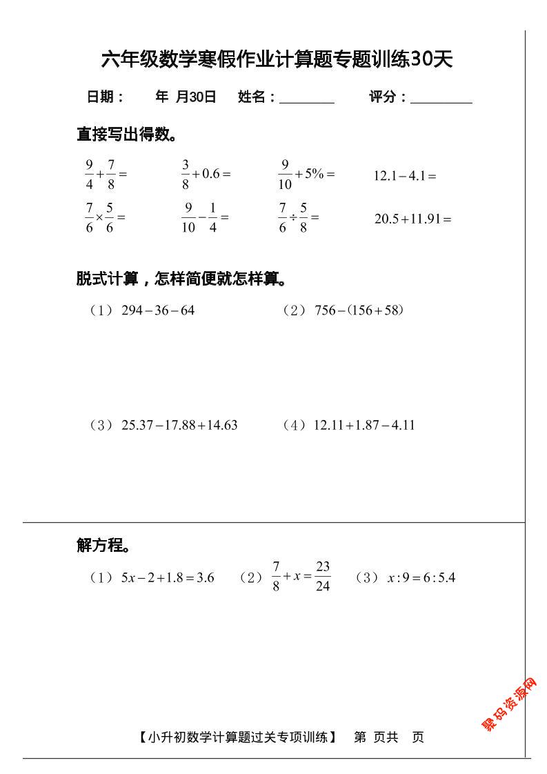 聚码网 六年级 六年级上数学寒假计算题过关专题训练(共30套) http://www.appstore168.com/118389.html