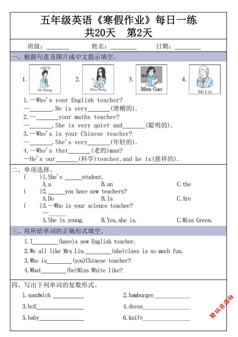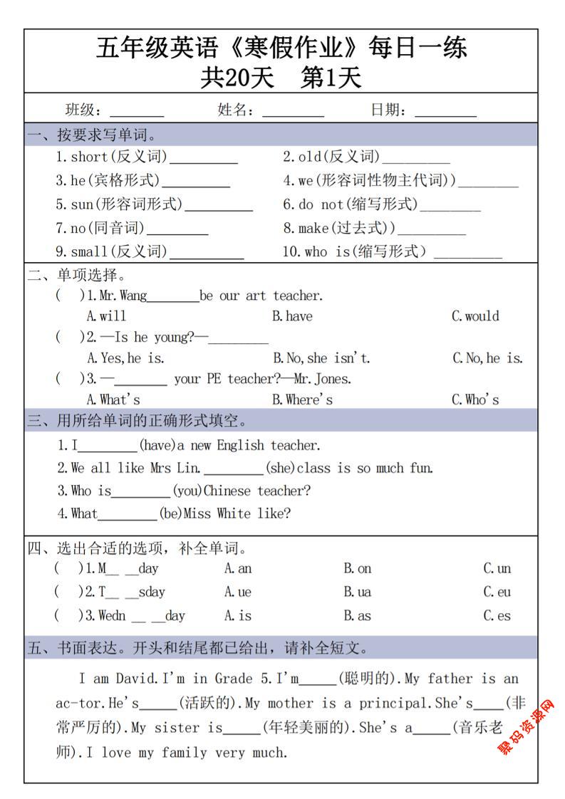 聚码网 五年级 五年级上英语《寒假作业》每日一练共20天 http://www.appstore168.com/118392.html