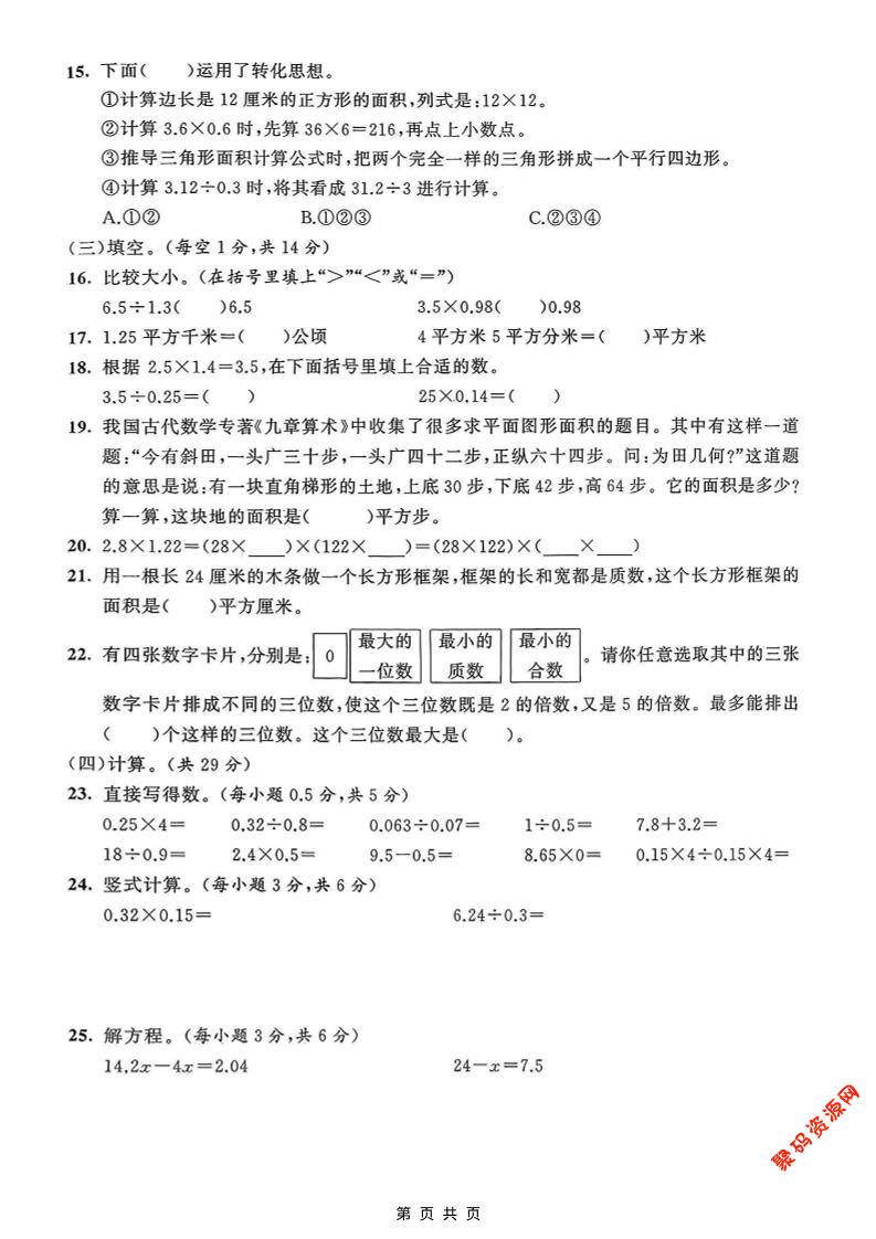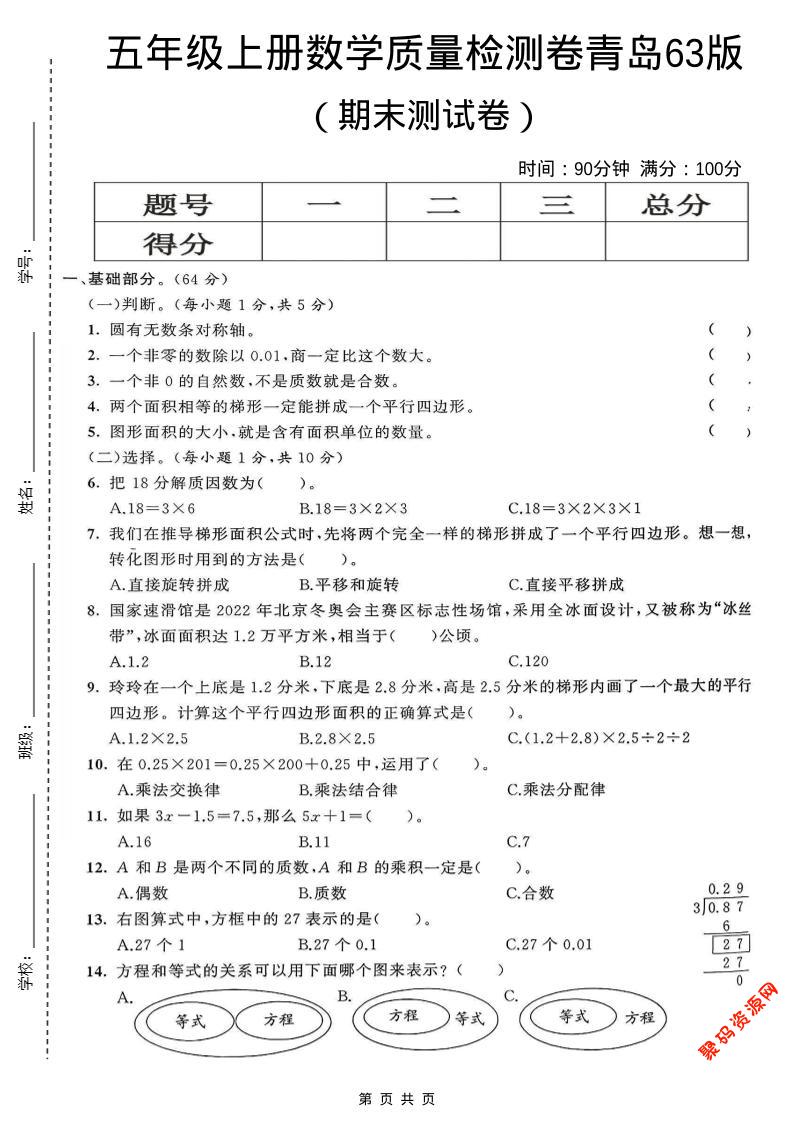 聚码网 五年级 五年级上数学期末测试卷5《青岛63版》 http://www.appstore168.com/118403.html