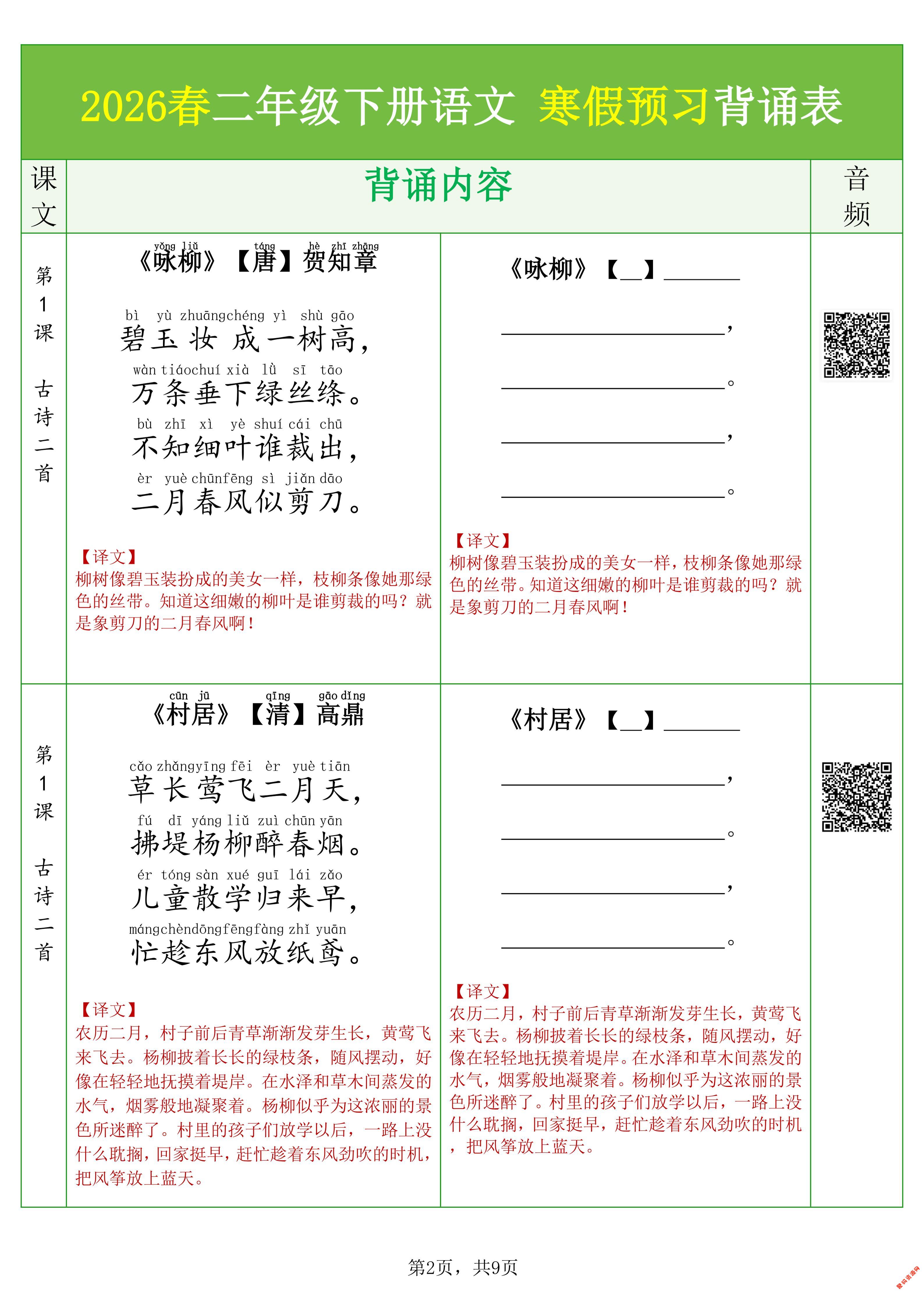 聚码网 二年级 26春二下语文寒假预习背诵与默写(必背课文、古诗、文言文、日积月累)9页 http://www.appstore168.com/118427.html