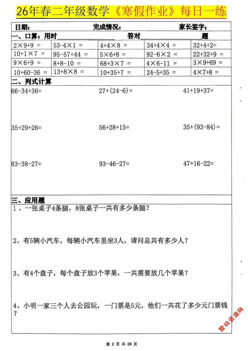 - 二年级数学下寒假作业每日一练30天(口算竖式应用题)(30页) 2026-02-16